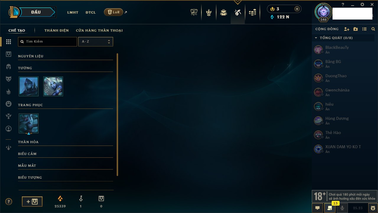 Rank Đơn: Vàng IIIKhung: BạcTướng: 171 - Còn 101359 THXTrang Phục: 88Rank ĐTCL: Kim Cương IVLinh Thú: 200