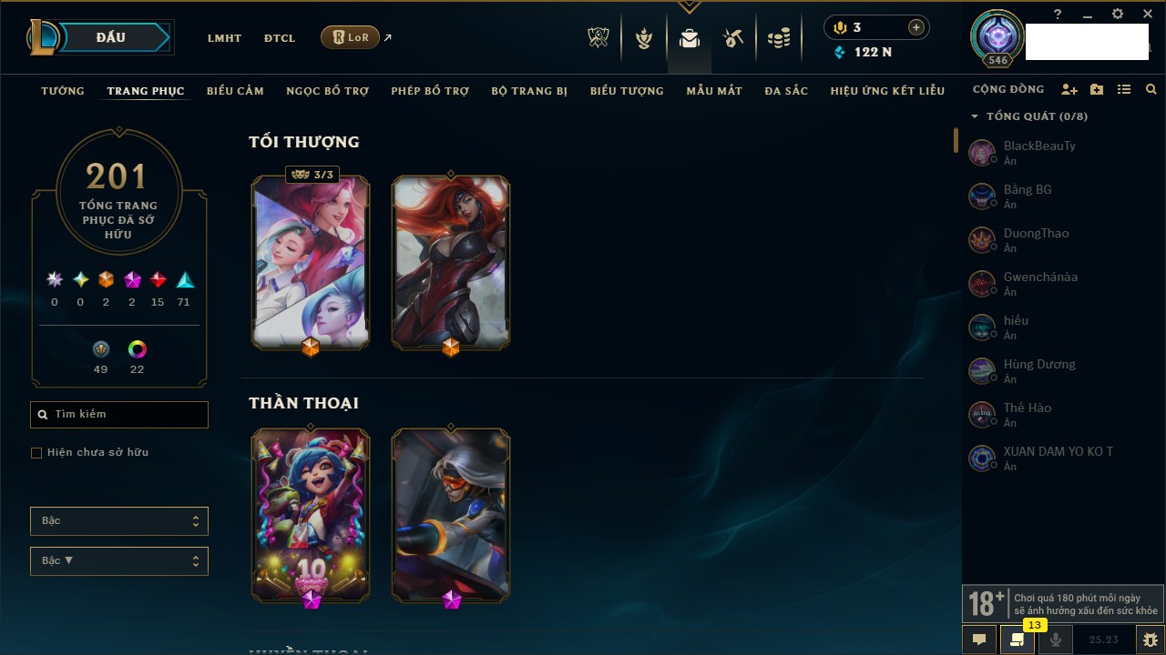 Rank Đơn: Lục Bảo IVKhung: Bạch kimTướng: 171 - Còn 128452 THXTrang Phục: 193Rank ĐTCL: Bạc IIILinh Thú: 100