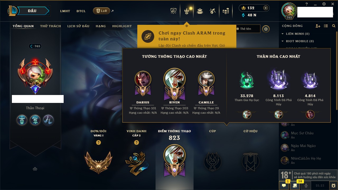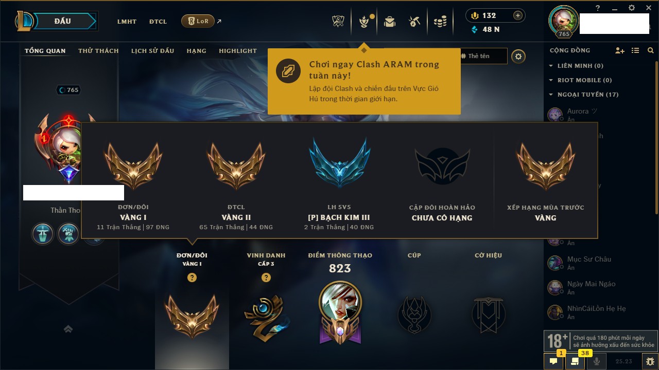 Rank Đơn: Bạc IIKhung: Chưa có khungTướng: 145 - Còn 12230 THXTrang Phục: 183Rank ĐTCL: Chưa RankLinh Thú: 71