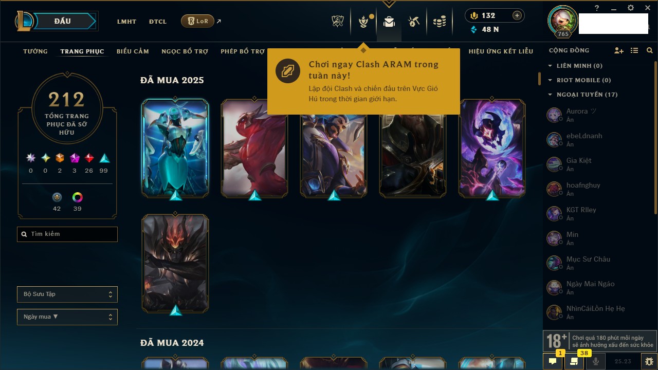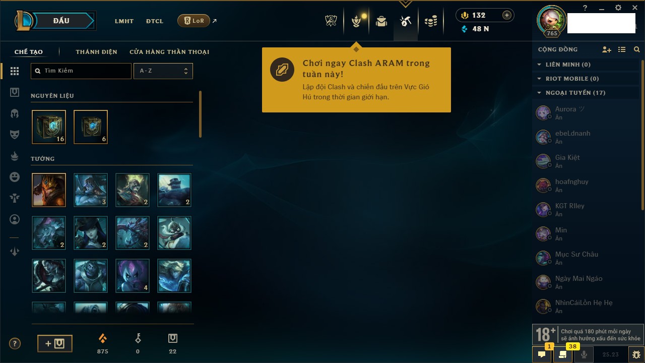 Rank Đơn: Chưa RankKhung: Chưa có khungTướng: 169 - Còn 43188 THXTrang Phục: 205Rank ĐTCL: Chưa RankLinh Thú: 259
