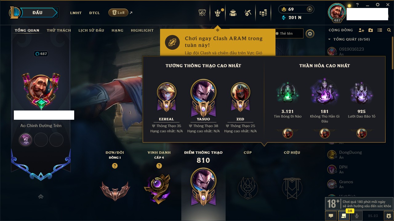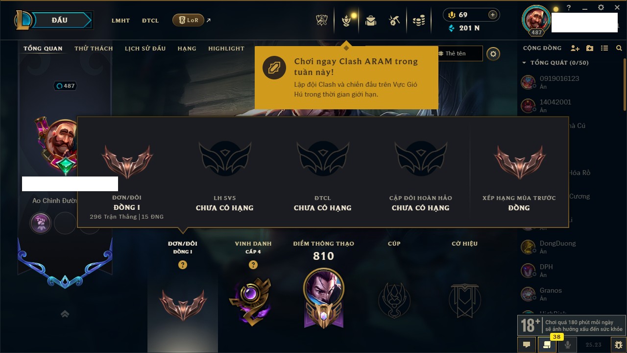 Rank Đơn: Đồng IIKhung: ĐồngTướng: 170 - Còn 66145 THXTrang Phục: 215Rank ĐTCL: Chưa RankLinh Thú: 52