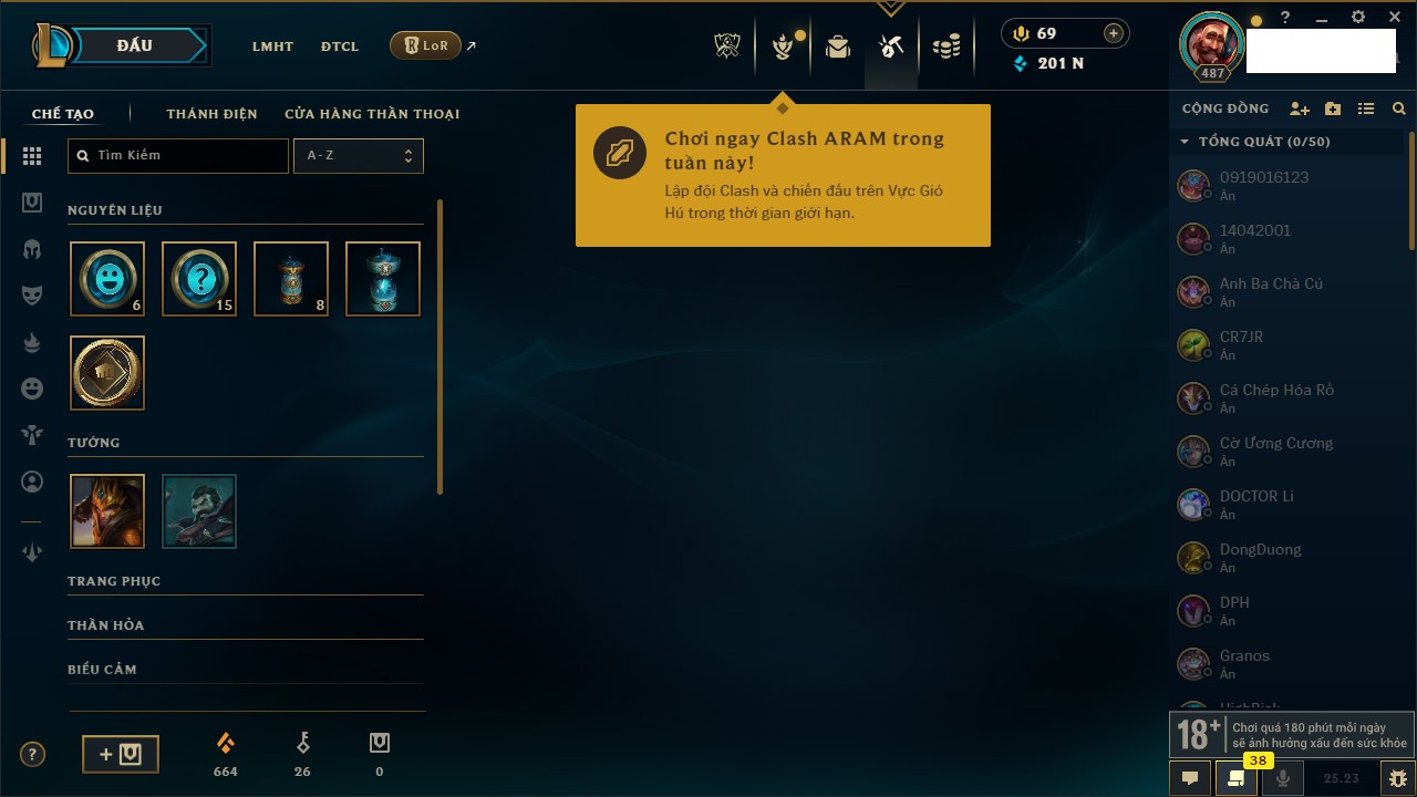 Rank Đơn: Vàng IIIKhung: BạcTướng: 171 - Còn 101359 THXTrang Phục: 88Rank ĐTCL: Kim Cương IVLinh Thú: 200