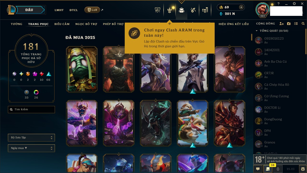 Rank Đơn: Vàng IVKhung: VàngTướng: 171 - Còn 56632 THXTrang Phục: 215Rank ĐTCL: Bạc ILinh Thú: 71