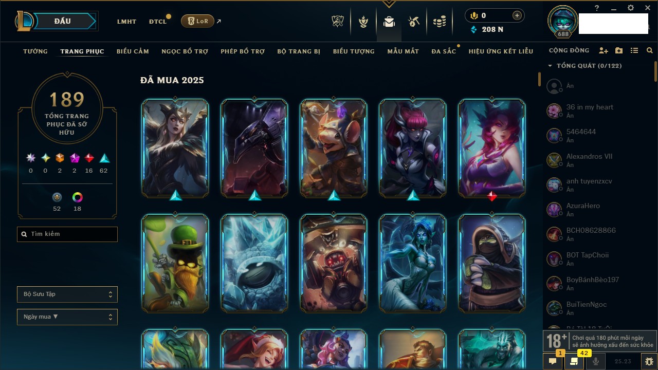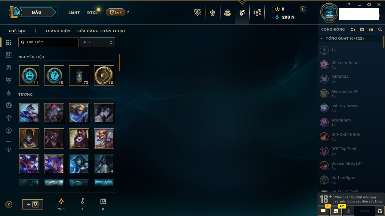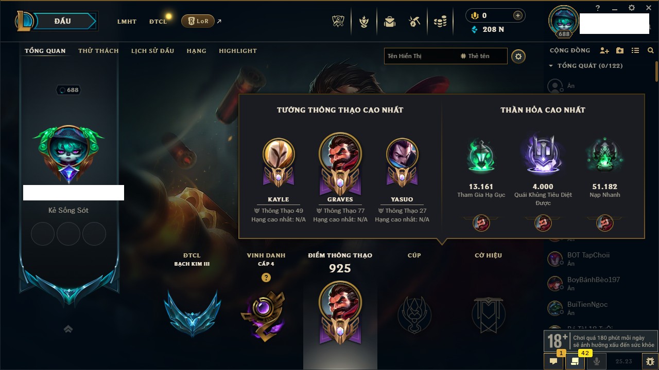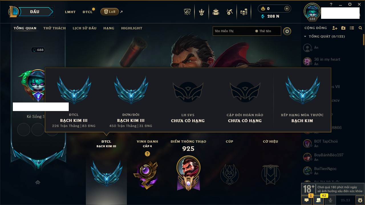 Rank Đơn: Bạch Kim IIKhung: Bạch kimTướng: 171 - Còn 316137 THXTrang Phục: 89Rank ĐTCL: Bạch Kim IIILinh Thú: 94