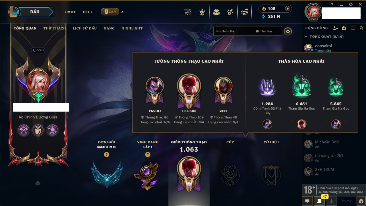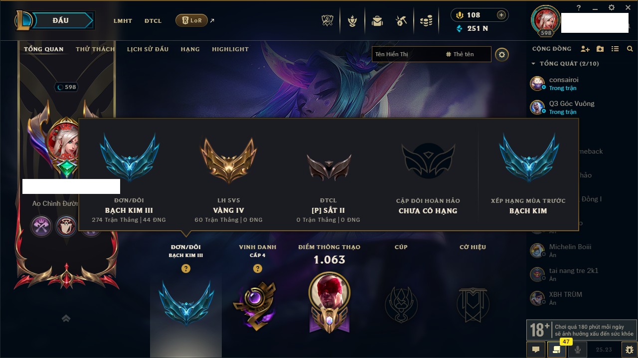 Rank Đơn: Bạch Kim IIKhung: Bạch kimTướng: 171 - Còn 141298 THXTrang Phục: 274Rank ĐTCL: Bạch Kim IILinh Thú: 188