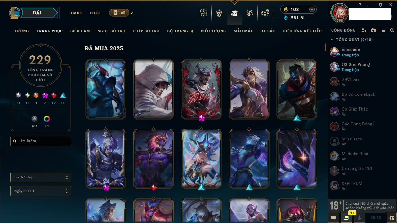 Rank Đơn: Vàng IIIKhung: VàngTướng: 171 - Còn 88128 THXTrang Phục: 329Rank ĐTCL: Chưa RankLinh Thú: 41