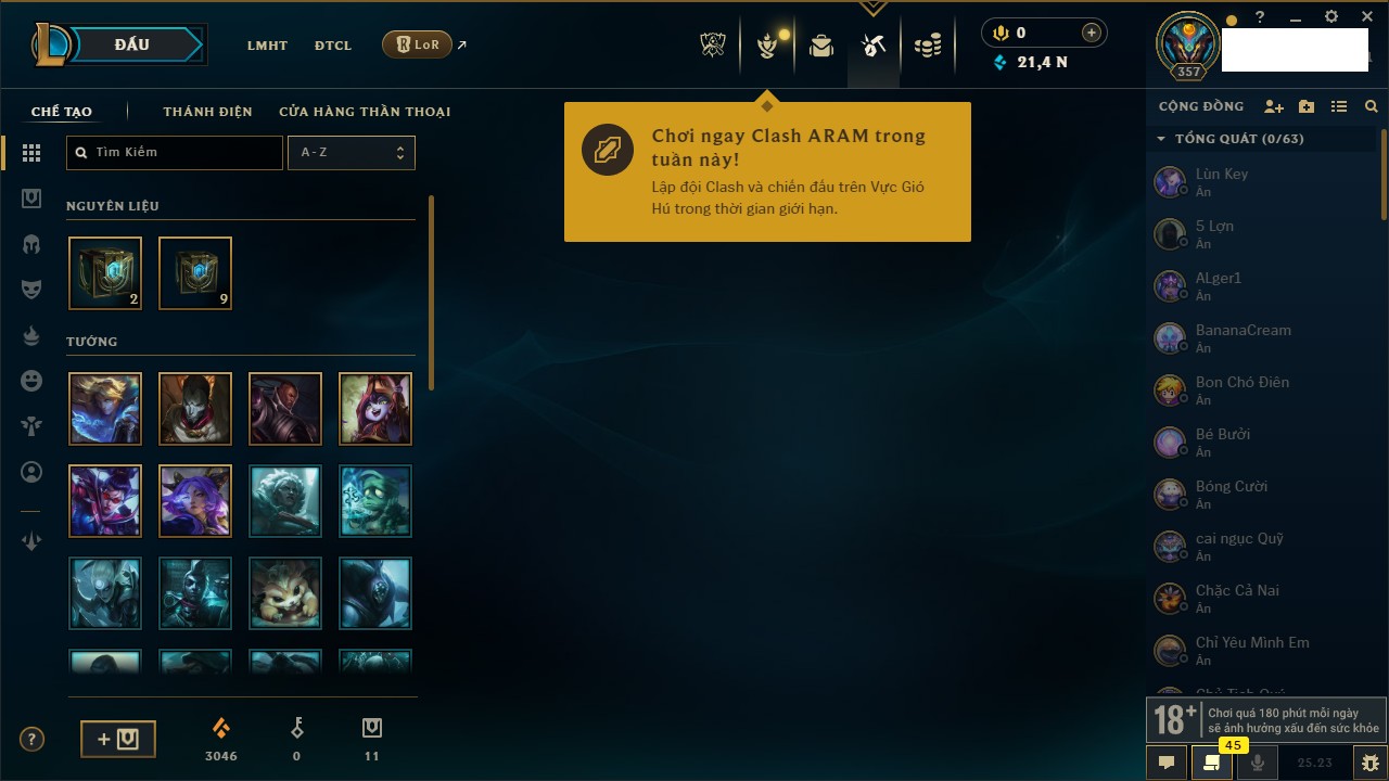 Rank Đơn: Vàng IIKhung: VàngTướng: 171 - Còn 34018 THXTrang Phục: 250Rank ĐTCL: Sắt IILinh Thú: 19