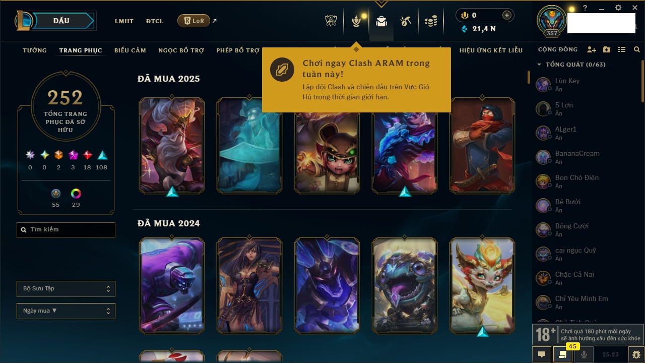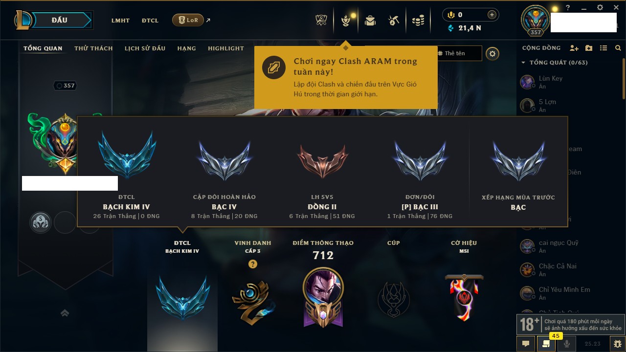 Rank Đơn: Bạc IIIKhung: Chưa có khungTướng: 171 - Còn 21493 THXTrang Phục: 252Rank ĐTCL: Bạch Kim IVLinh Thú: 123