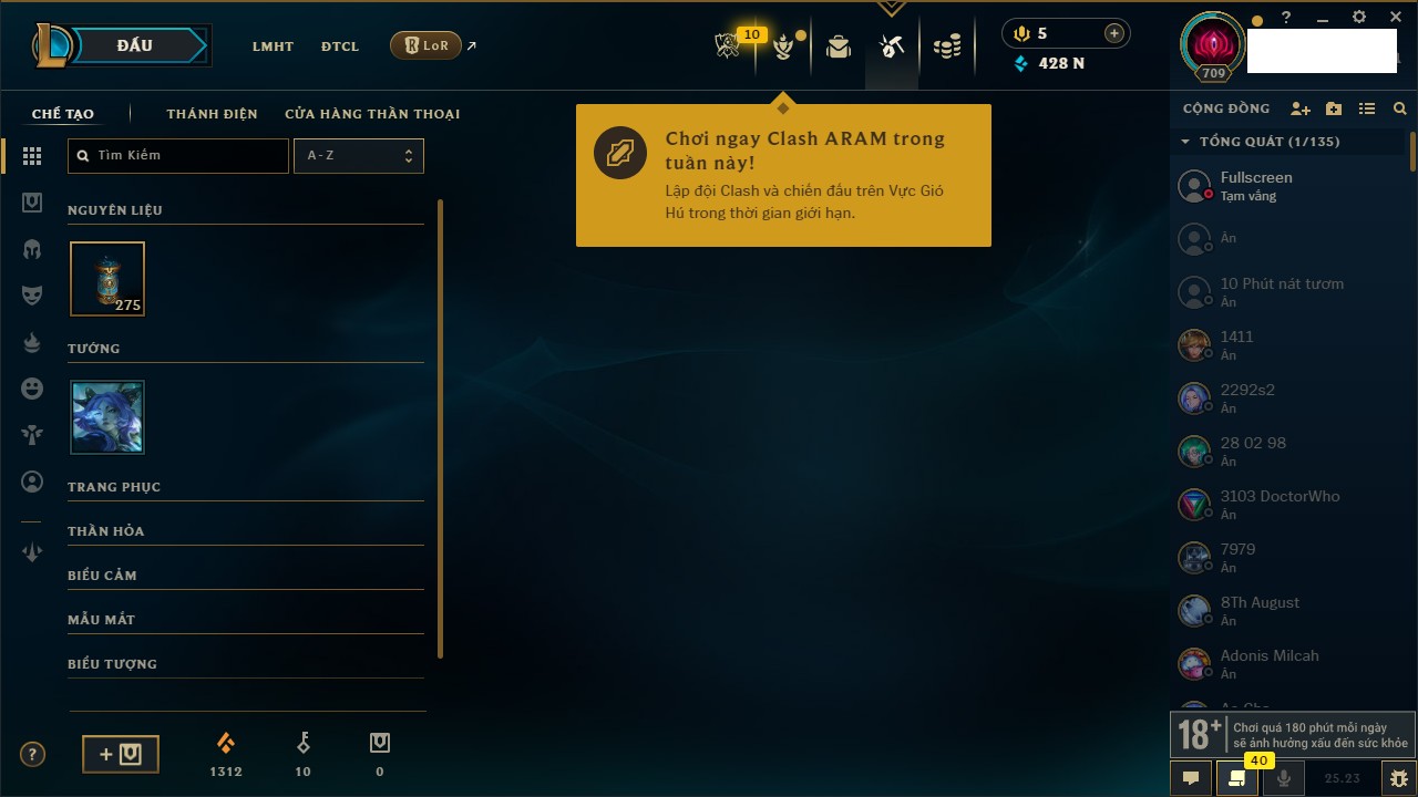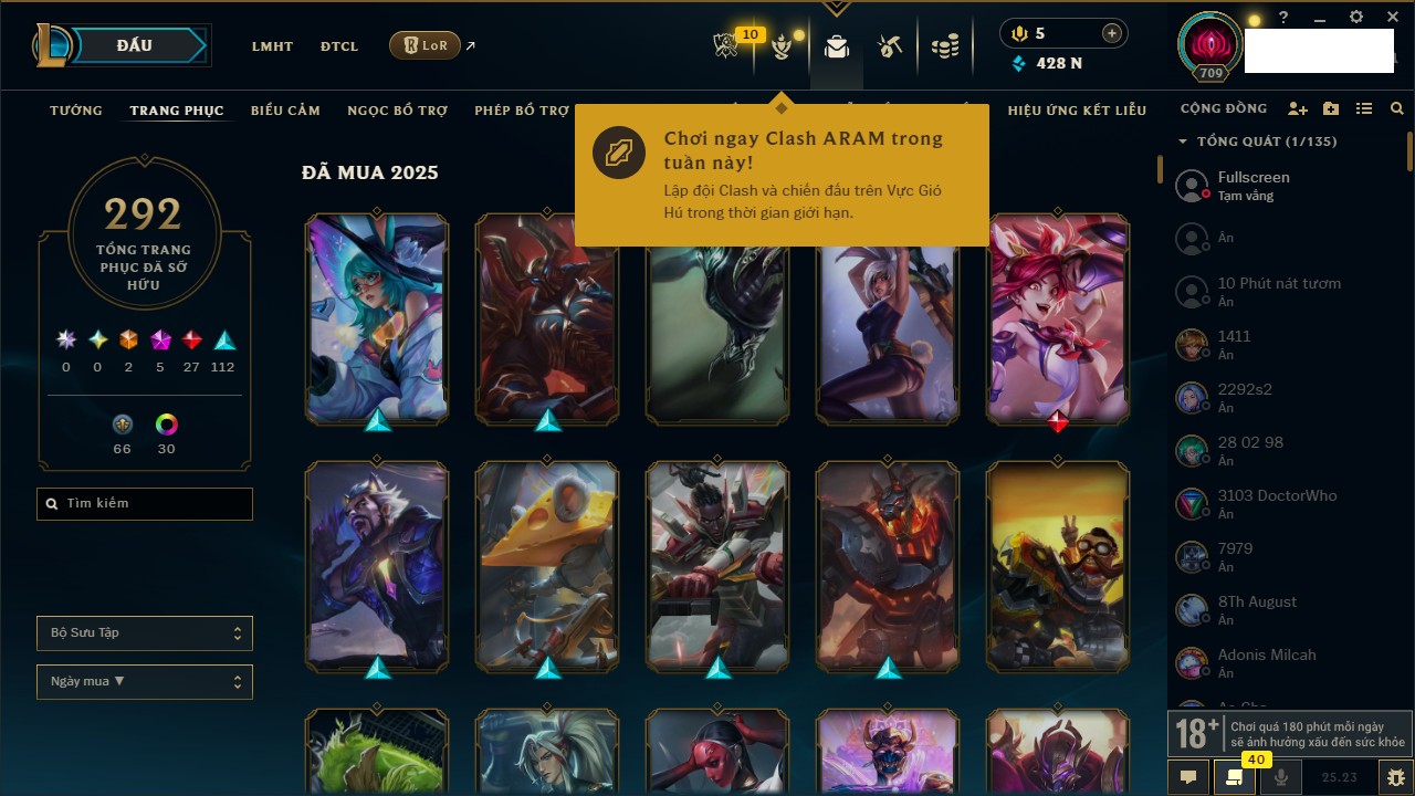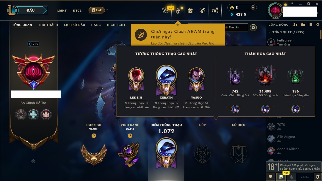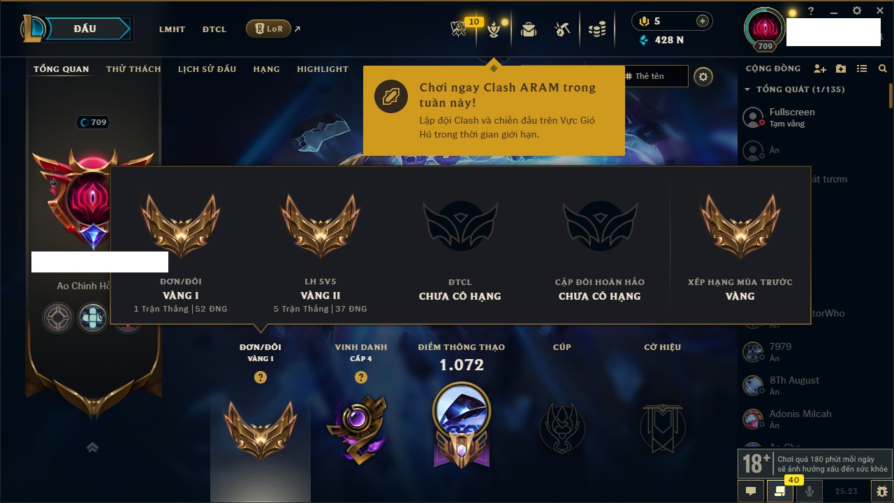 Rank Đơn: Vàng IKhung: Bạch kimTướng: 170 - Còn 212450 THXTrang Phục: 214Rank ĐTCL: Bạch Kim IVLinh Thú: 221