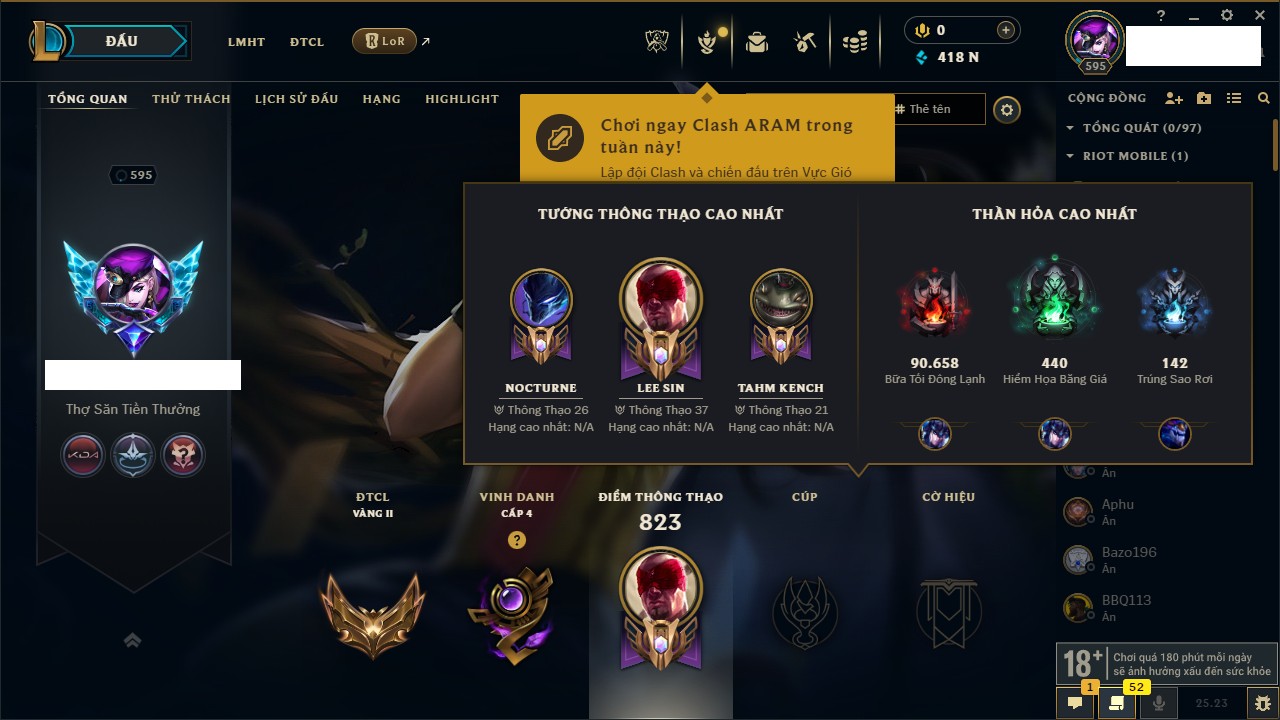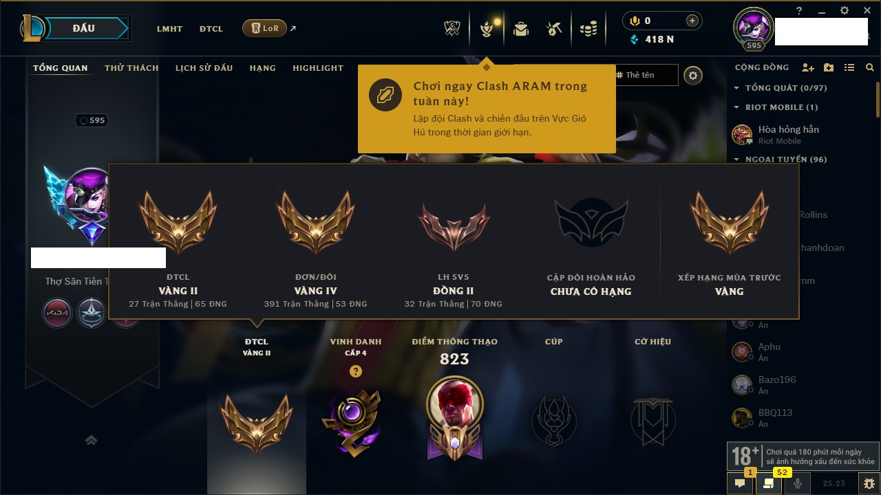 Rank Đơn: Đồng IIKhung: ĐồngTướng: 170 - Còn 66145 THXTrang Phục: 215Rank ĐTCL: Chưa RankLinh Thú: 52
