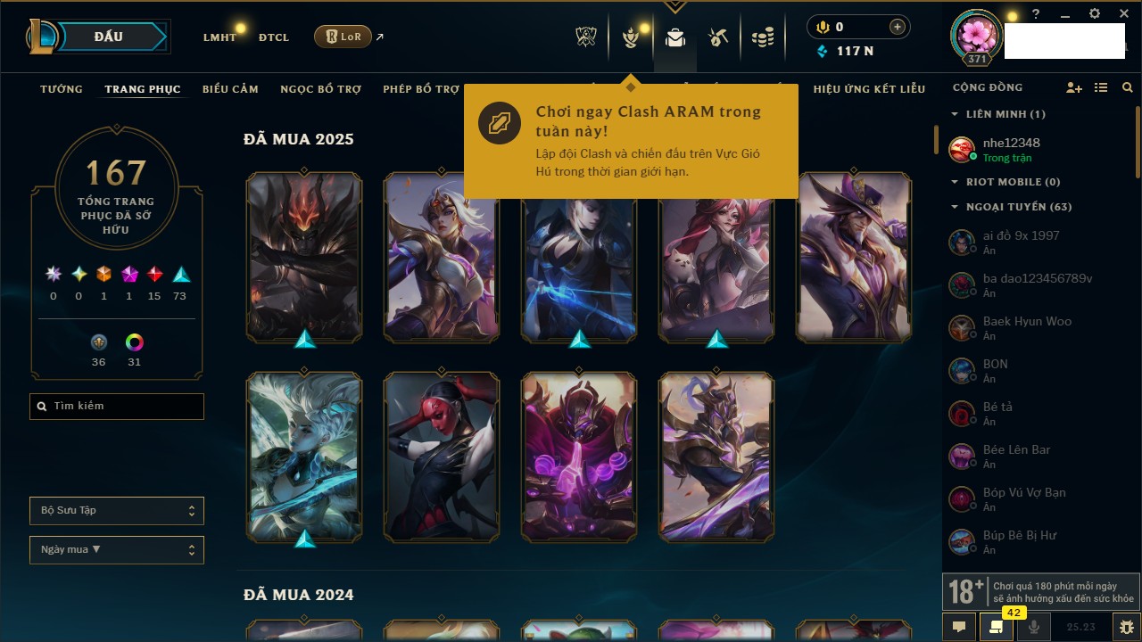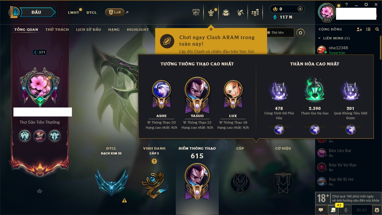 Rank Đơn: Chưa RankKhung: Chưa có khungTướng: 171 - Còn 164047 THXTrang Phục: 173Rank ĐTCL: Chưa RankLinh Thú: 77