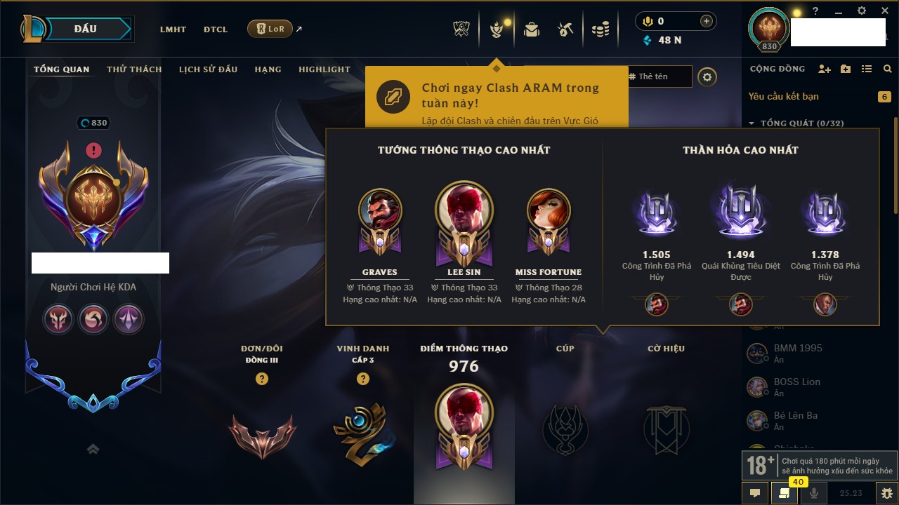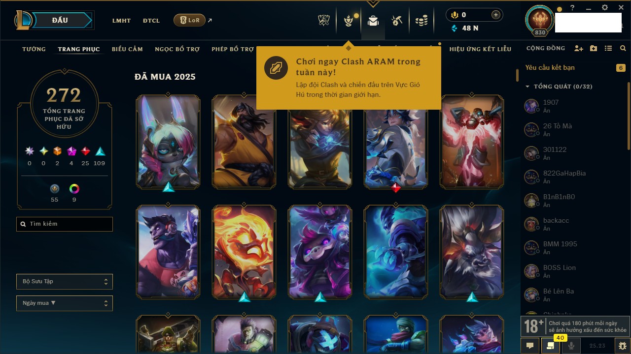Rank Đơn: Đồng IIIKhung: ĐồngTướng: 170 - Còn 48082 THXTrang Phục: 272Rank ĐTCL: Chưa RankLinh Thú: 84
