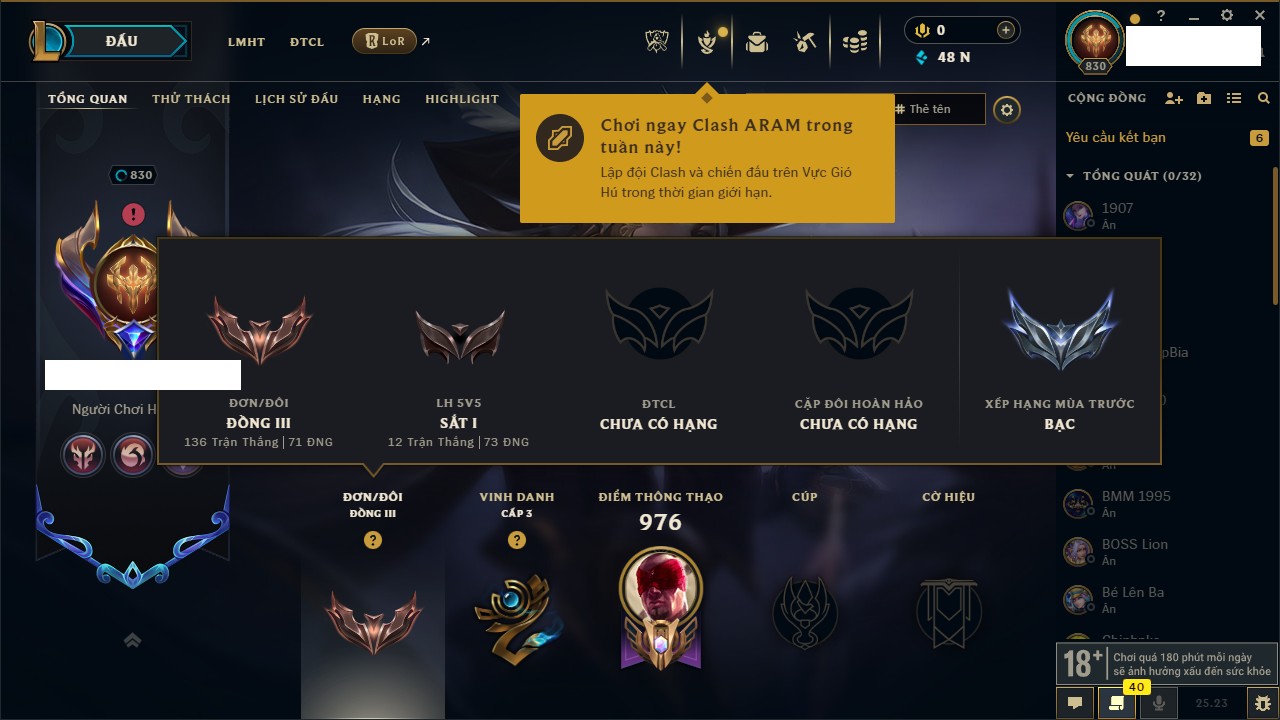 Rank Đơn: Bạch Kim IVKhung: Bạch kimTướng: 171 - Còn 182788 THXTrang Phục: 158Rank ĐTCL: Lục Bảo IVLinh Thú: 56