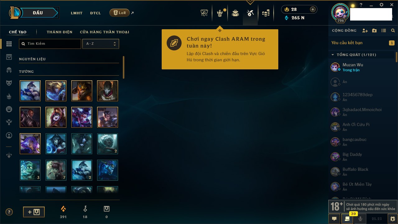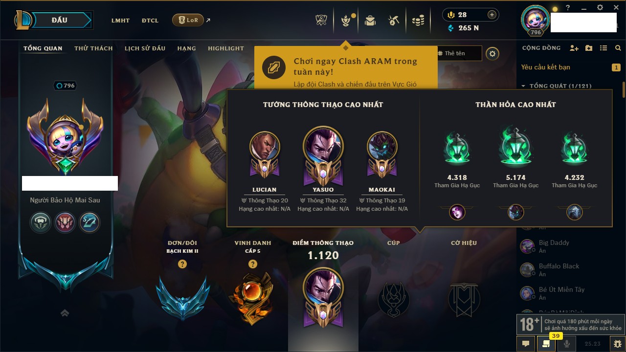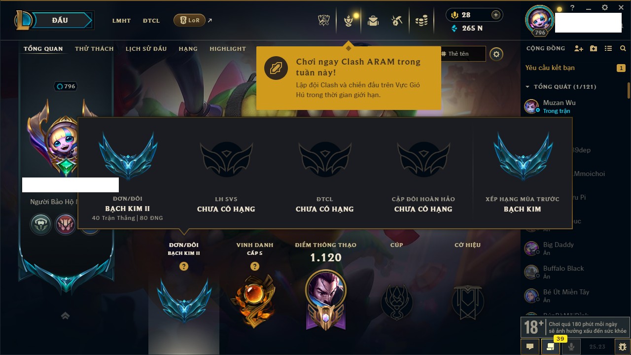 Rank Đơn: Vàng IKhung: Bạch kimTướng: 170 - Còn 212450 THXTrang Phục: 214Rank ĐTCL: Bạch Kim IVLinh Thú: 221