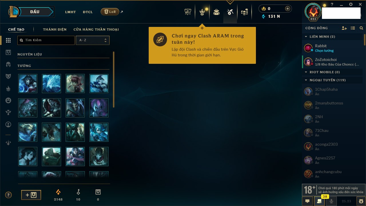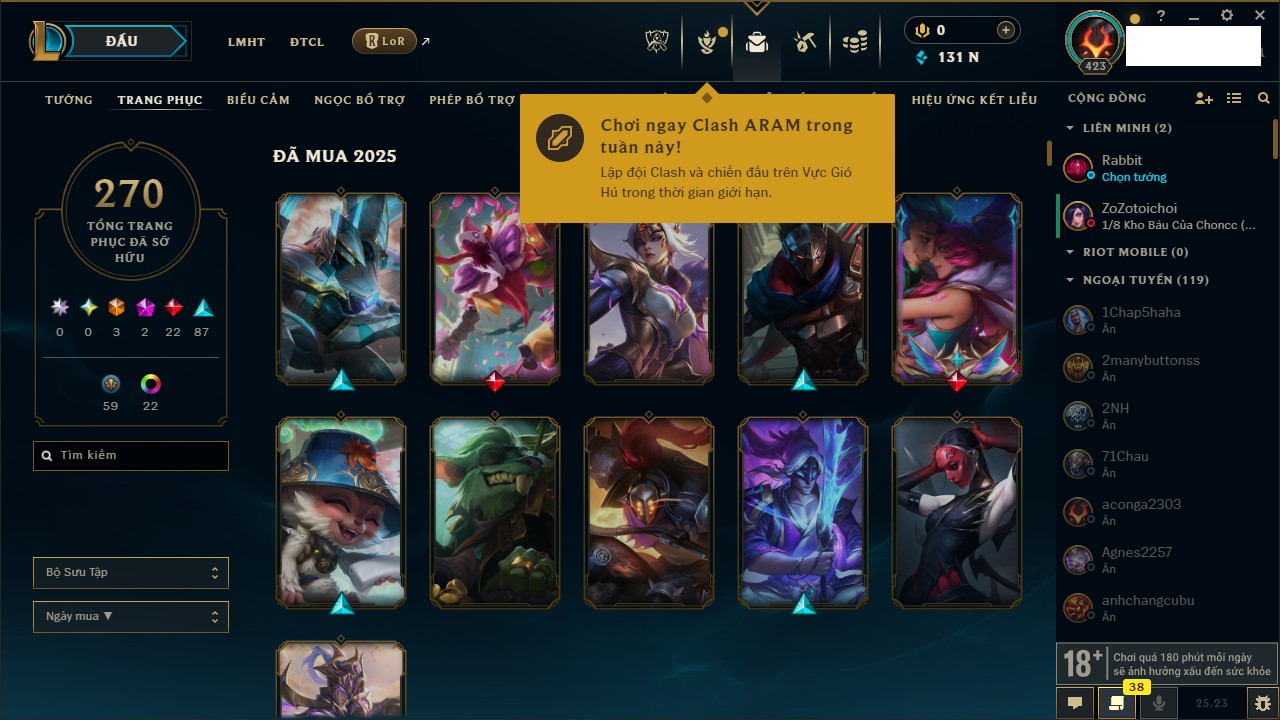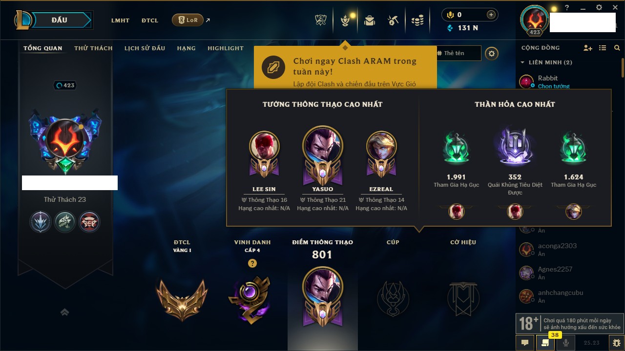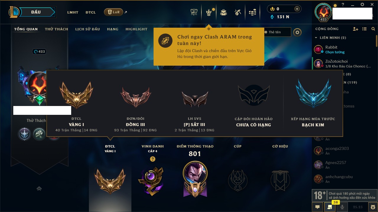 Rank Đơn: Vàng IKhung: Bạch kimTướng: 170 - Còn 212450 THXTrang Phục: 214Rank ĐTCL: Bạch Kim IVLinh Thú: 221