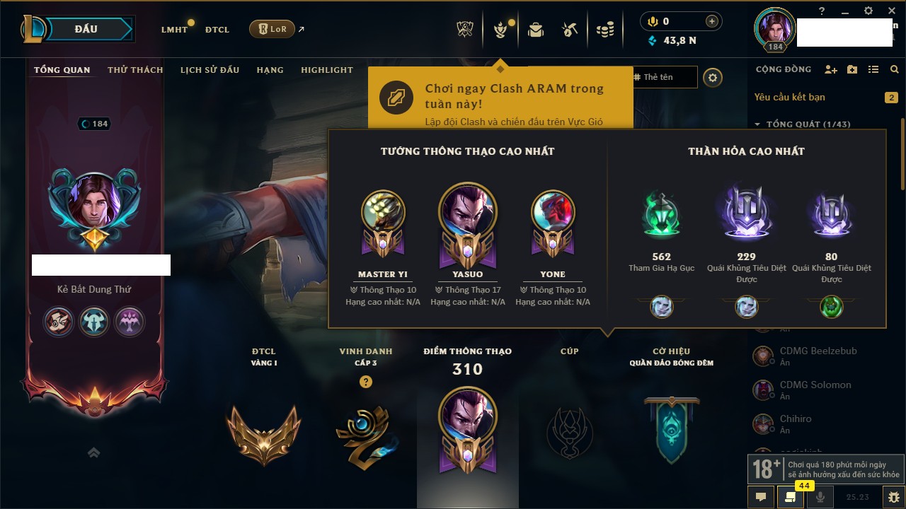 Rank Đơn: Bạch Kim IIIKhung: Bạch kimTướng: 171 - Còn 136108 THXTrang Phục: 261Rank ĐTCL: Bạc IVLinh Thú: 73