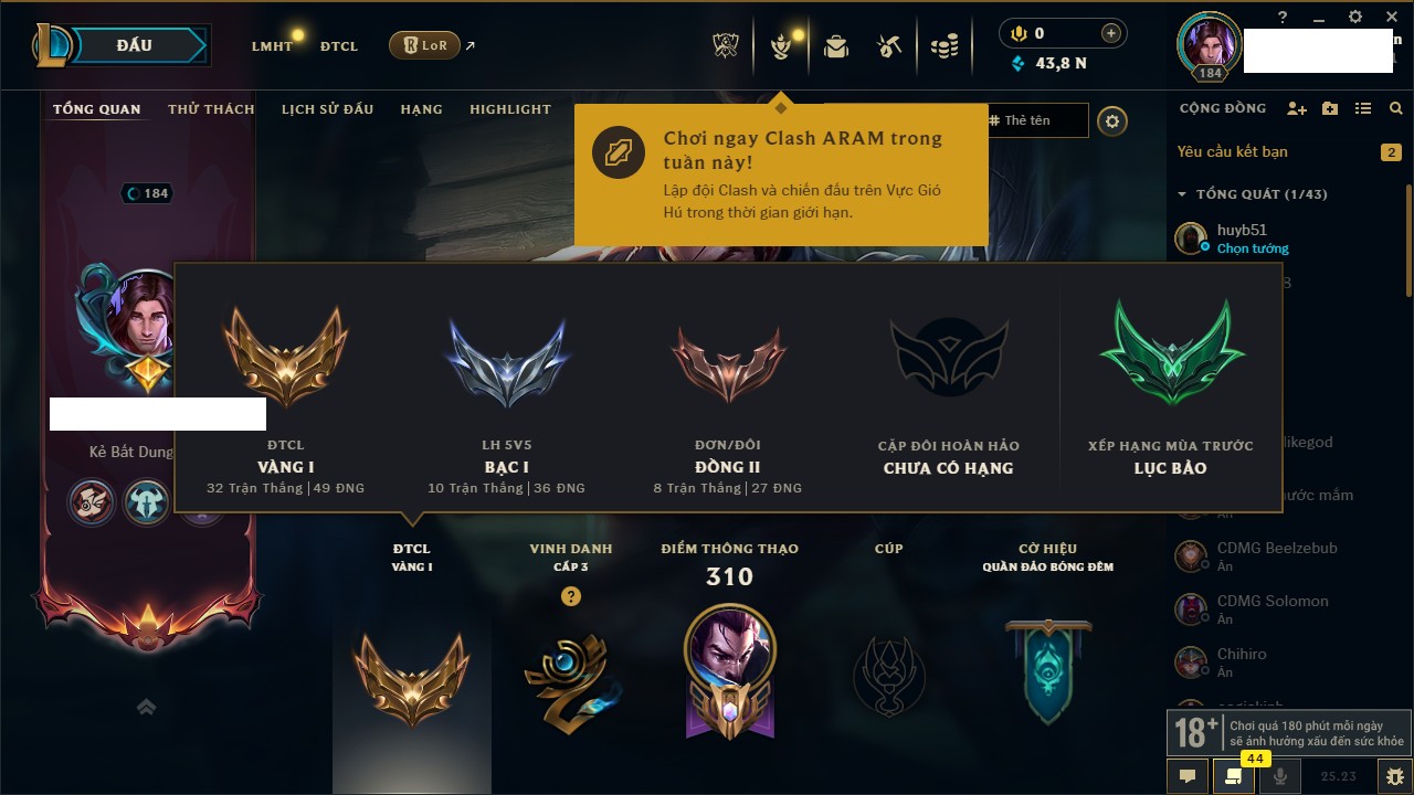 Rank Đơn: Lục Bảo IVKhung: VàngTướng: 171 - Còn 154648 THXTrang Phục: 203Rank ĐTCL: Bạch Kim IVLinh Thú: 69