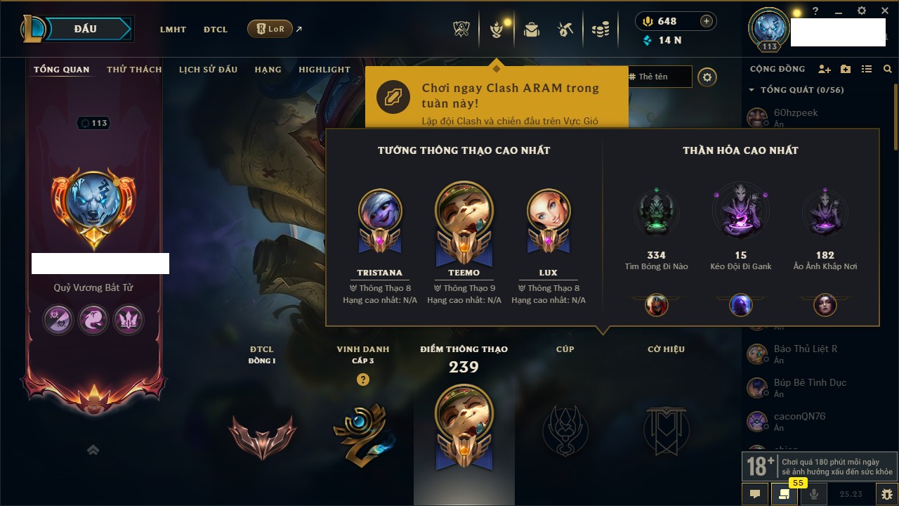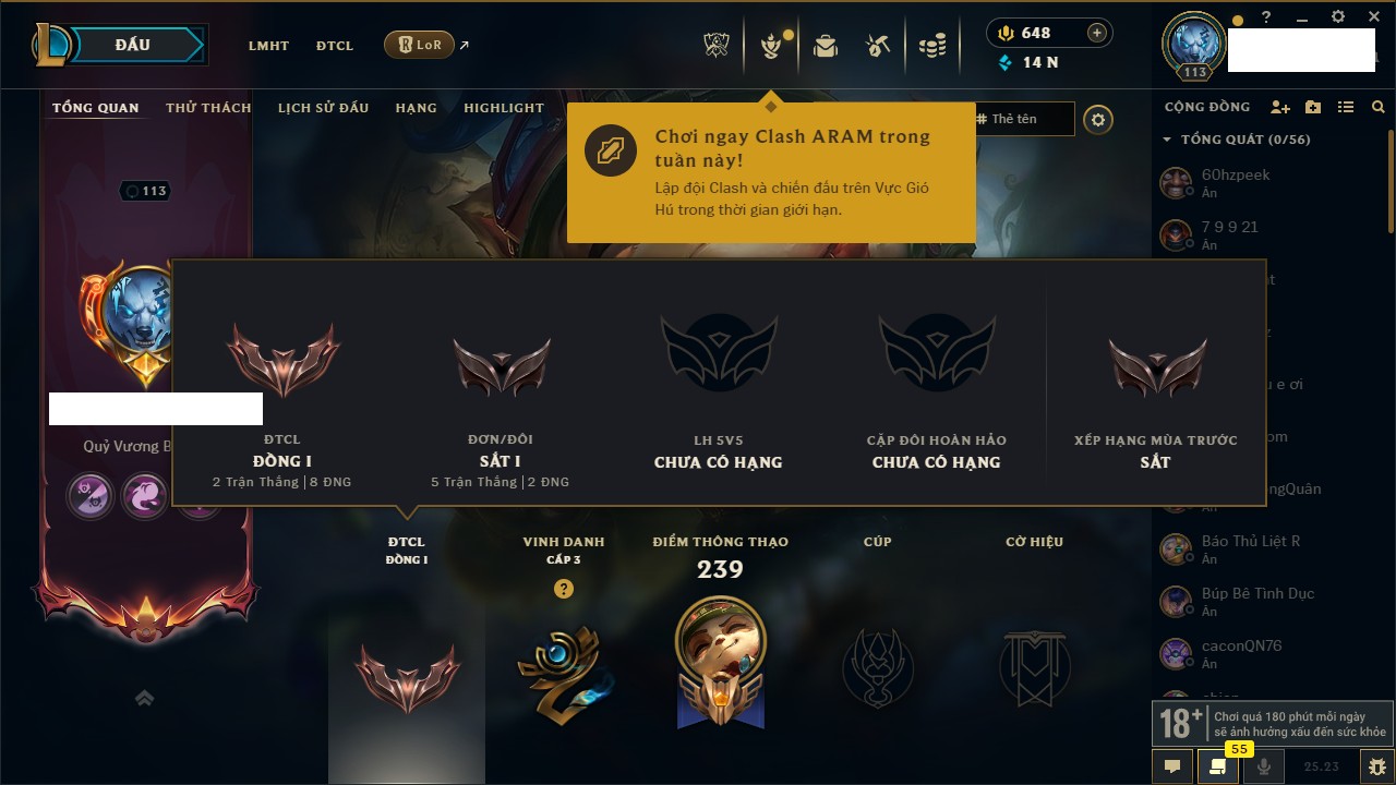 Rank Đơn: Đồng IKhung: ĐồngTướng: 168 - Còn 11447 THXTrang Phục: 245Rank ĐTCL: Chưa RankLinh Thú: 53