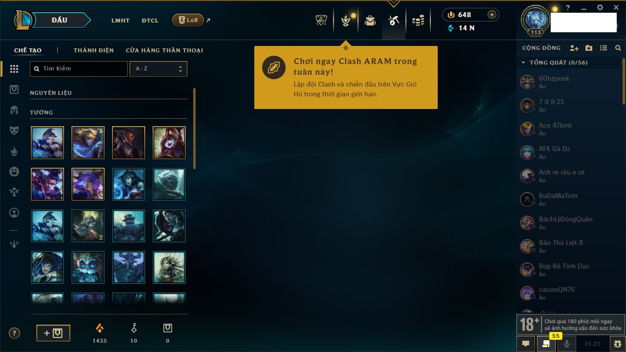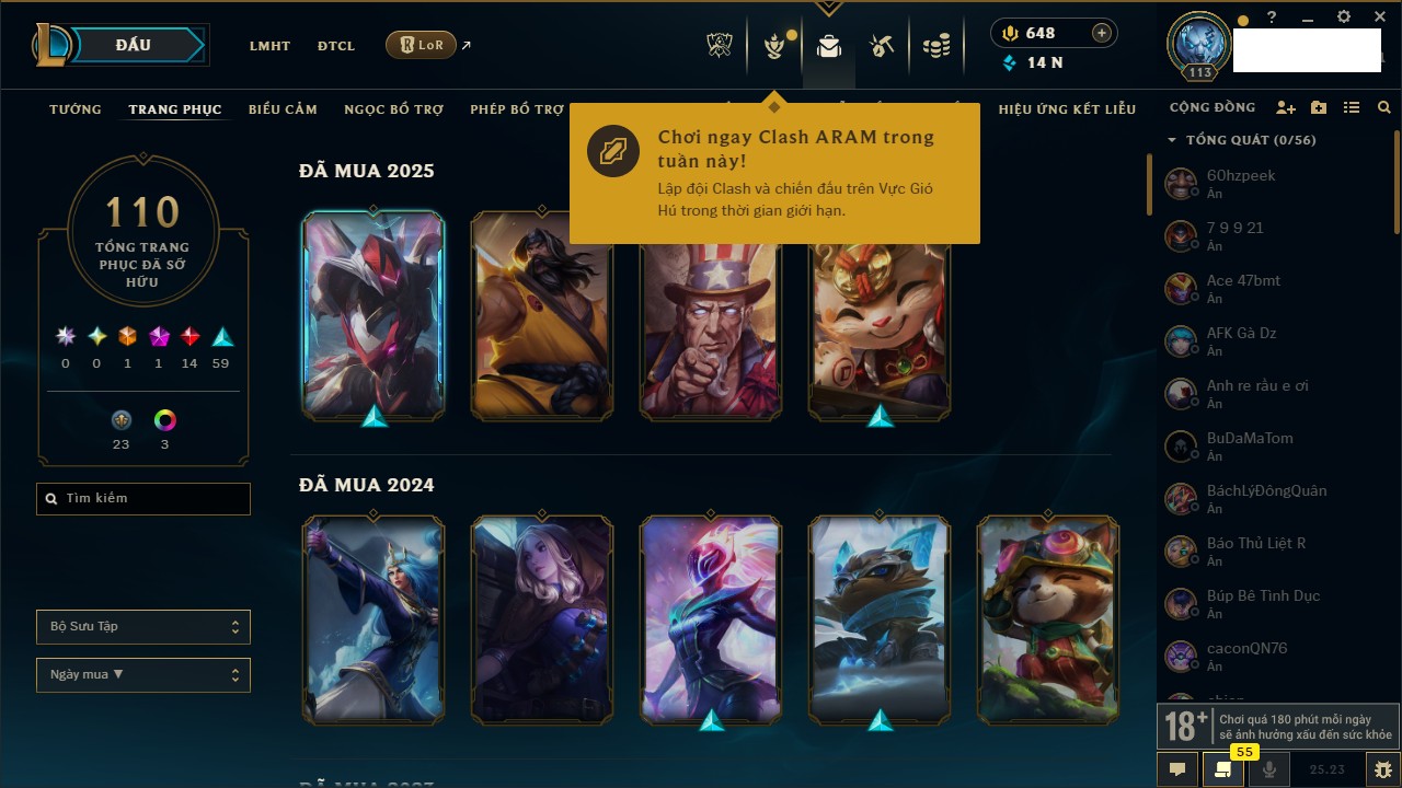 Rank Đơn: Vàng IIIKhung: BạcTướng: 171 - Còn 101359 THXTrang Phục: 88Rank ĐTCL: Kim Cương IVLinh Thú: 200