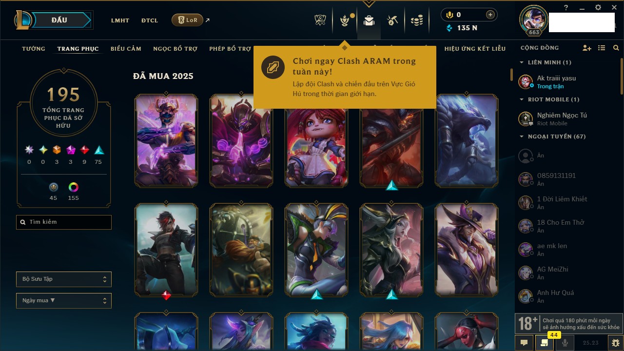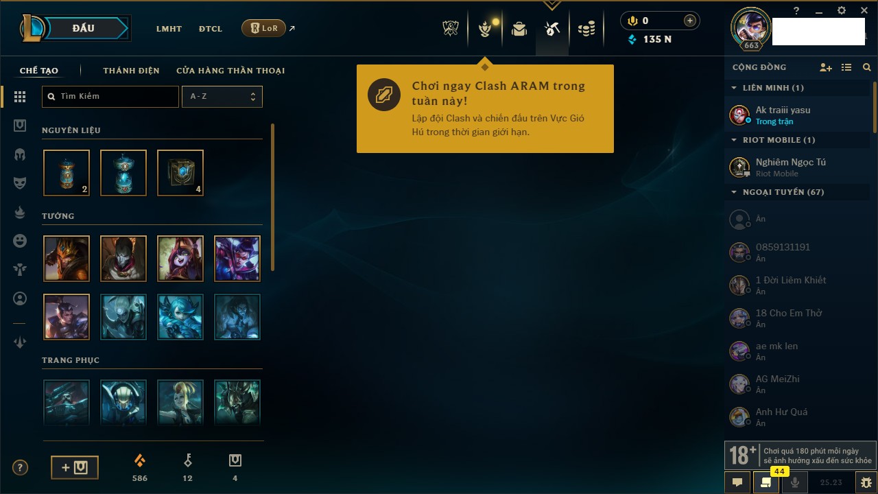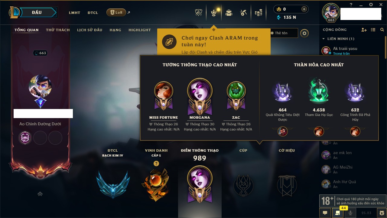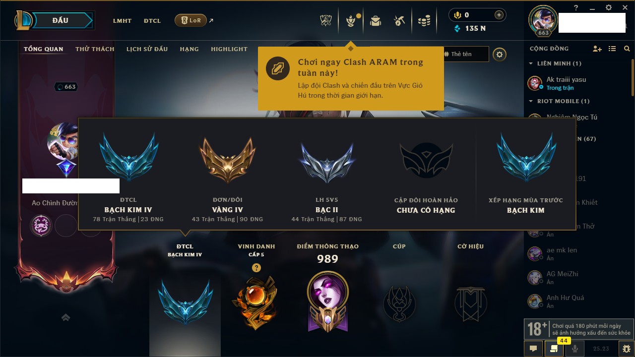 Rank Đơn: Vàng IVKhung: VàngTướng: 171 - Còn 135001 THXTrang Phục: 195Rank ĐTCL: Bạch Kim IVLinh Thú: 147