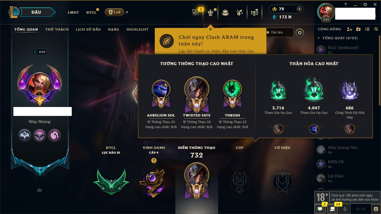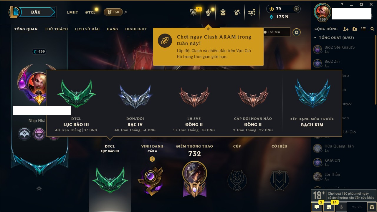 Rank Đơn: Bạc IVKhung: BạcTướng: 171 - Còn 173918 THXTrang Phục: 233Rank ĐTCL: Lục Bảo IIILinh Thú: 26