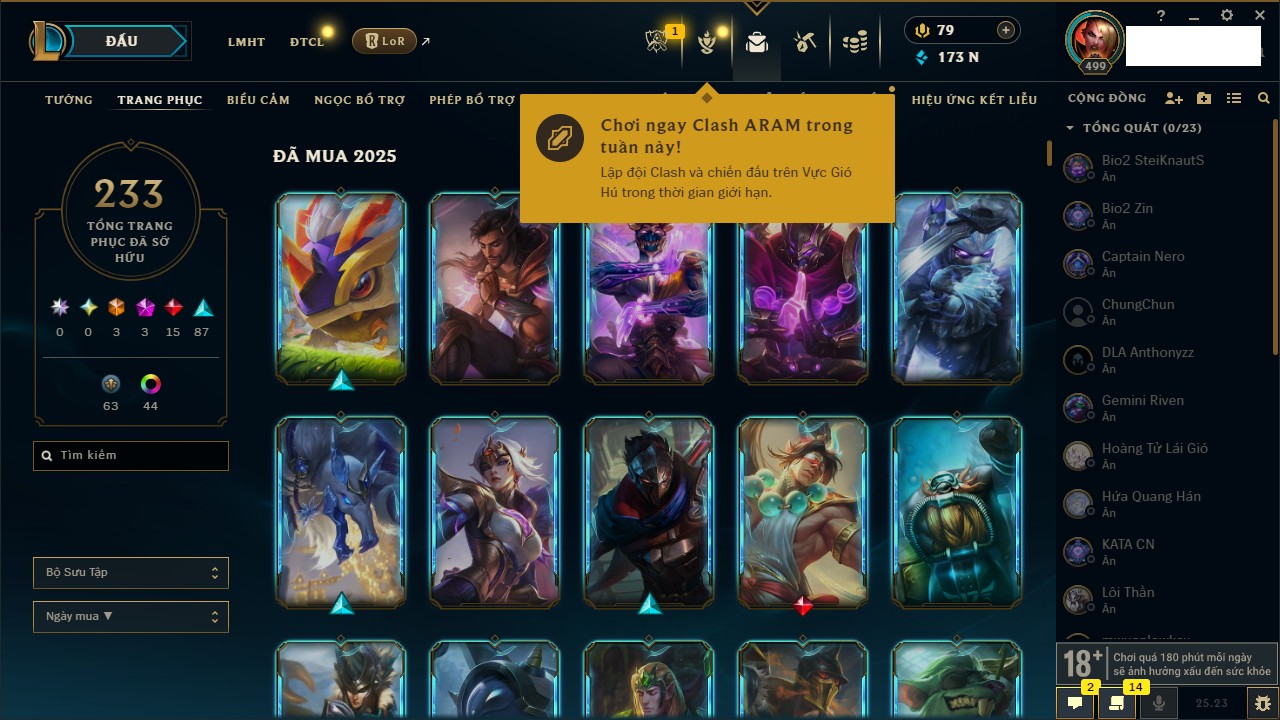 Rank Đơn: Vàng IIKhung: VàngTướng: 171 - Còn 219803 THXTrang Phục: 254Rank ĐTCL: Chưa RankLinh Thú: 78