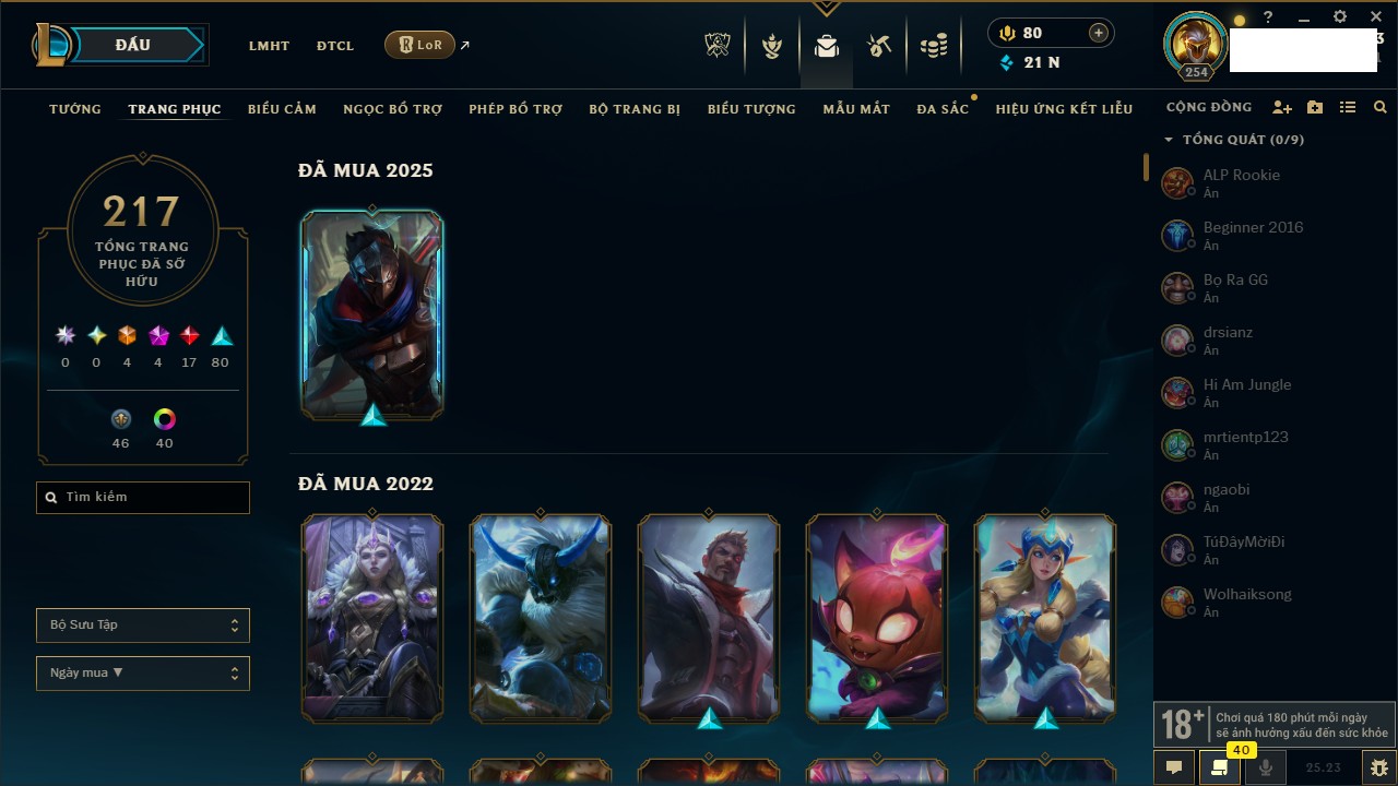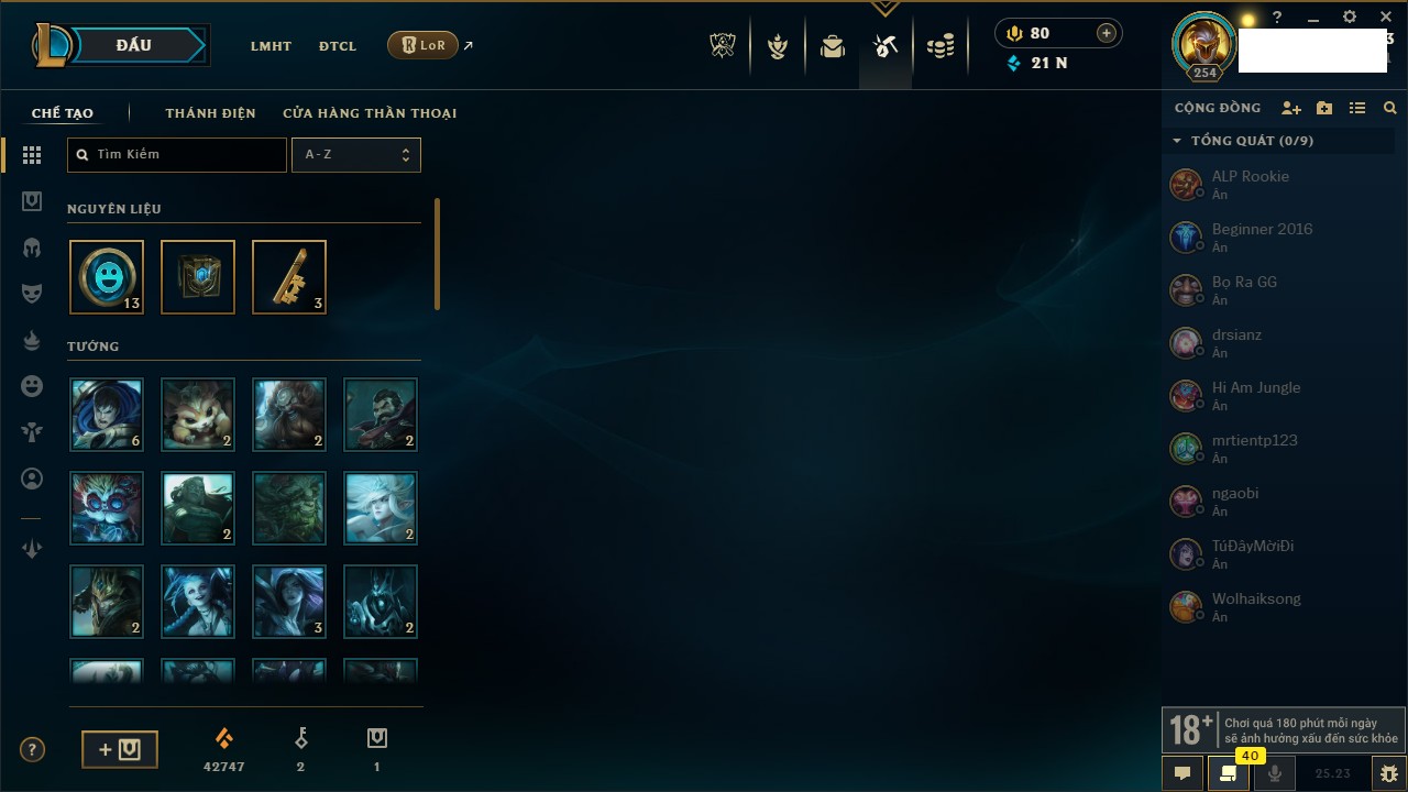 Rank Đơn: Chưa RankKhung: VàngTướng: 143 - Còn 16814 THXTrang Phục: 29Rank ĐTCL: Chưa RankLinh Thú: 91