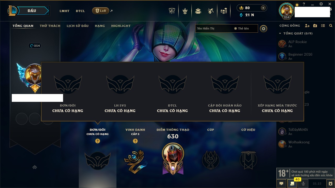 Rank Đơn: Bạc IKhung: Chưa có khungTướng: 172 - Còn 189559 THXTrang Phục: 182Rank ĐTCL: Chưa RankLinh Thú: 96