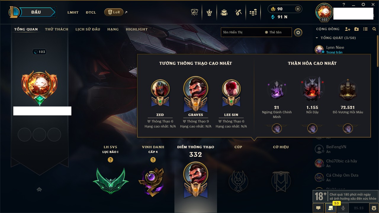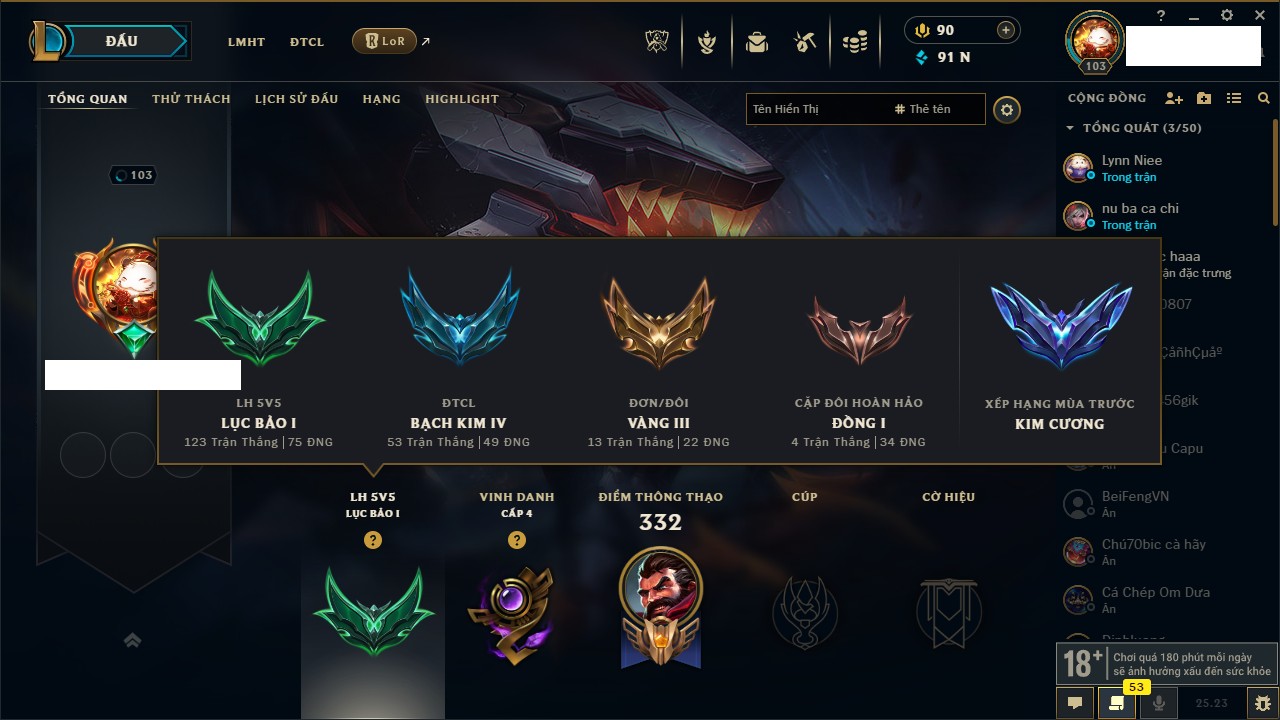 Rank Đơn: Bạc III Khung: Bạc Tướng: 170 - Còn 30078 THX Trang Phục: 225 Rank ĐTCL: Chưa Rank Linh Thú: 138