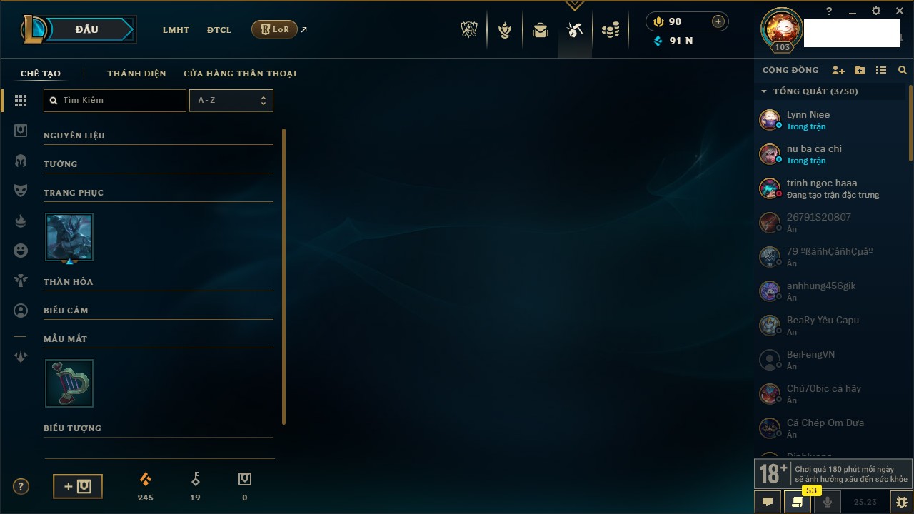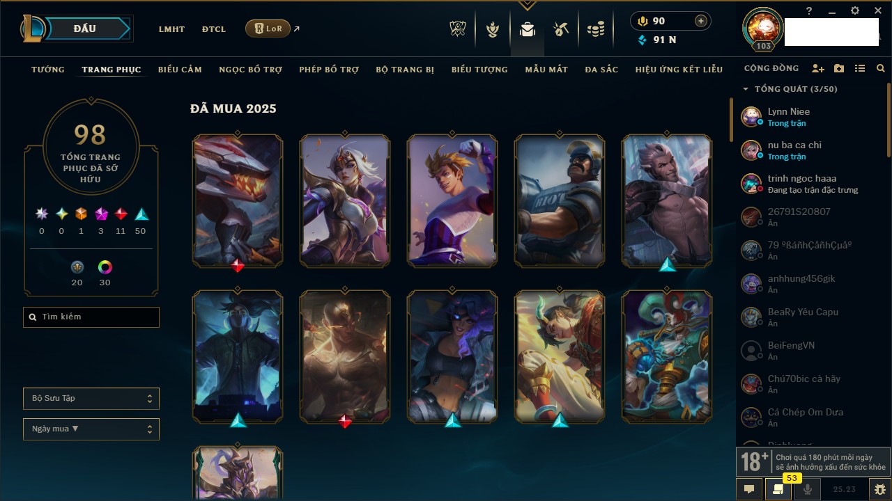 Rank Đơn: Vàng III Khung: Vàng Tướng: 171 - Còn 91047 THX Trang Phục: 98 Rank ĐTCL: Bạch Kim IV Linh Thú: 281