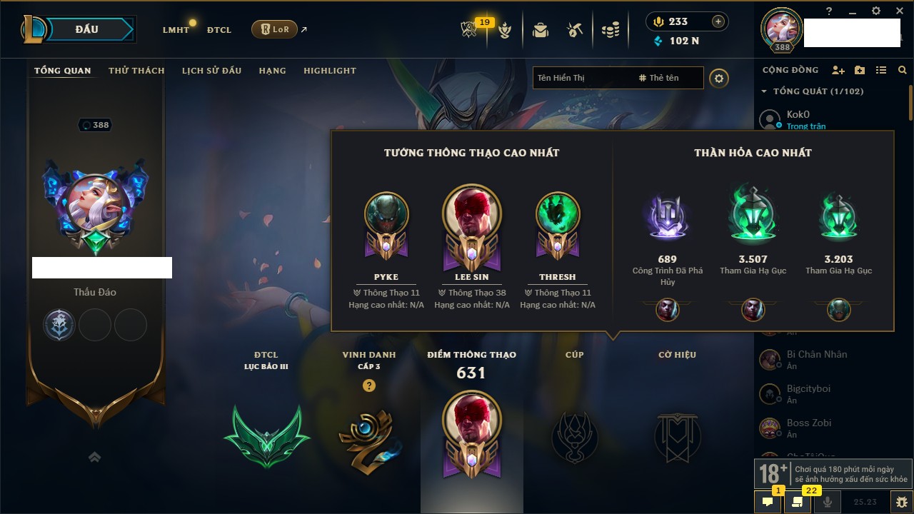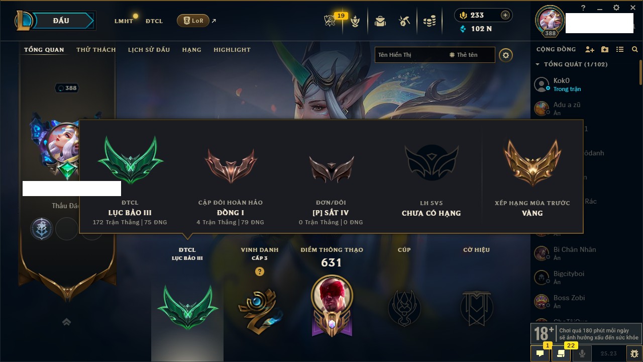 Rank Đơn: Bạc IIKhung: Chưa có khungTướng: 145 - Còn 12230 THXTrang Phục: 183Rank ĐTCL: Chưa RankLinh Thú: 71
