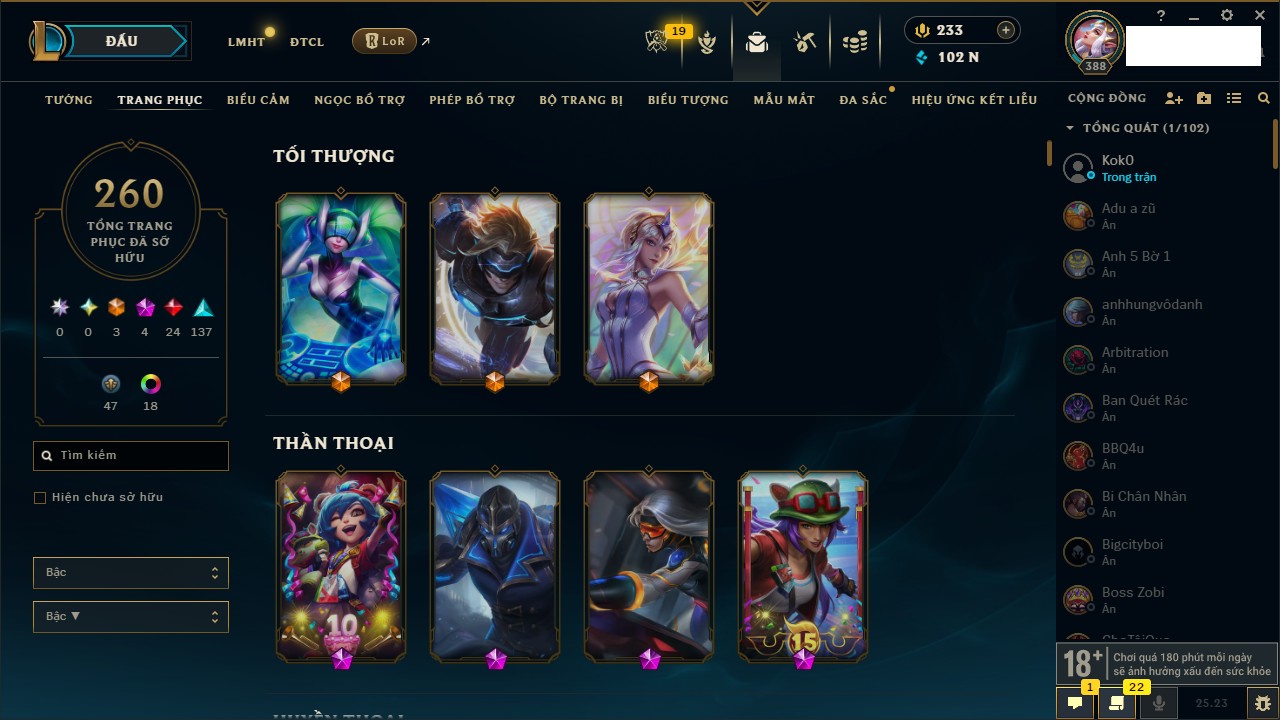 Rank Đơn: Chưa RankKhung: Chưa có khungTướng: 169 - Còn 43188 THXTrang Phục: 205Rank ĐTCL: Chưa RankLinh Thú: 259