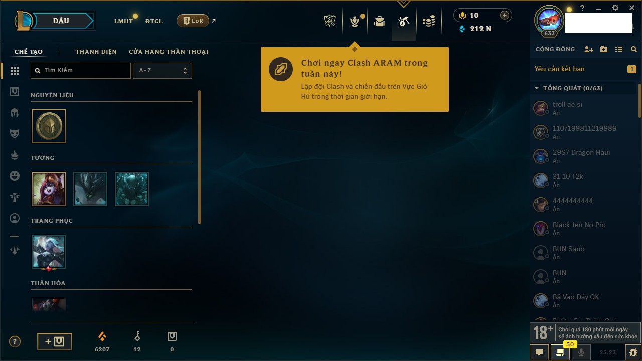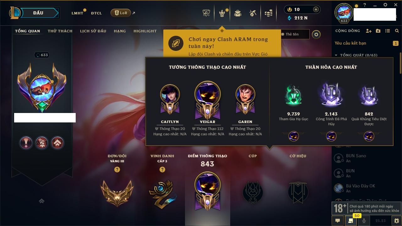 - Cấp 633 - 212,486 IP - Veigar 1,243,527 Thông Thạo