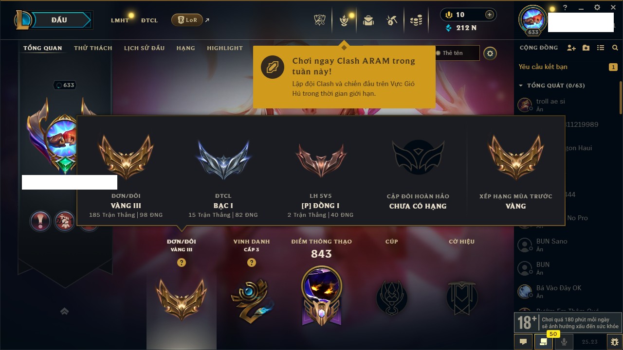 Rank Đơn: Sắt IIIKhung: SắtTướng: 171 - Còn 62070 THXTrang Phục: 198Rank ĐTCL: Bạch Kim IIILinh Thú: 237
