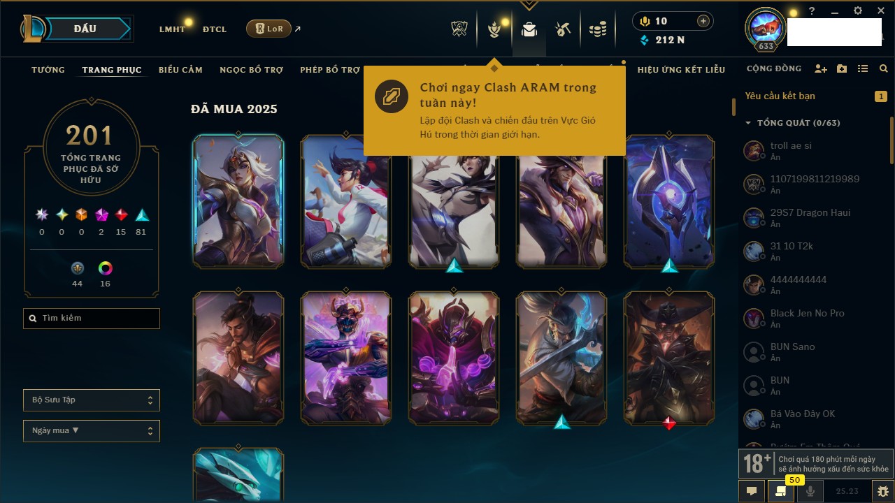 Rank Đơn: Vàng IIKhung: VàngTướng: 171 - Còn 219803 THXTrang Phục: 254Rank ĐTCL: Chưa RankLinh Thú: 78