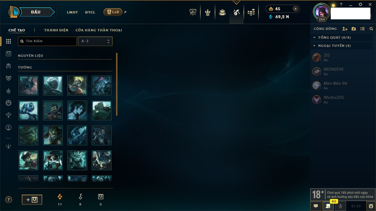 Rank Đơn: Vàng IIKhung: VàngTướng: 171 - Còn 34018 THXTrang Phục: 250Rank ĐTCL: Sắt IILinh Thú: 19