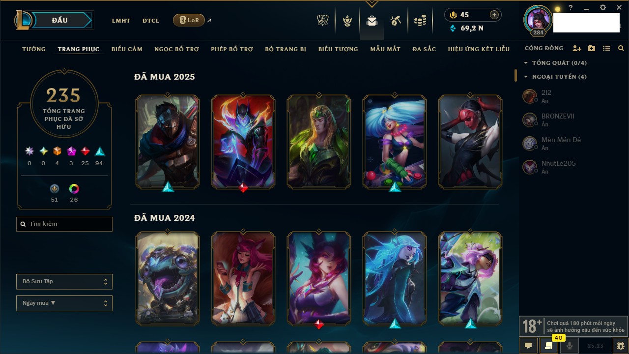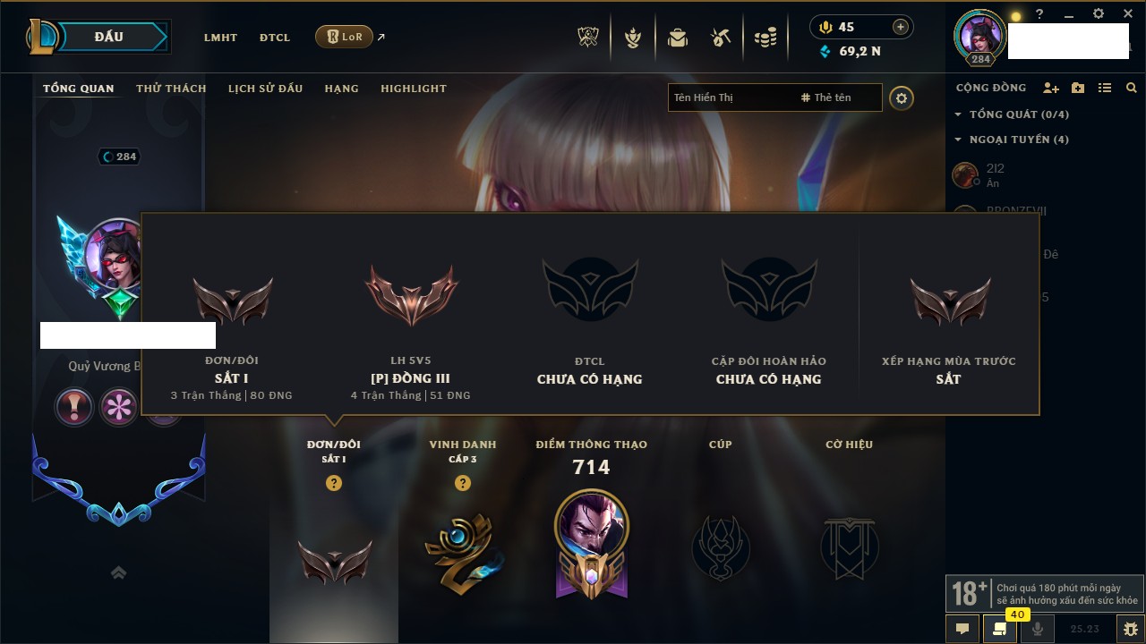 Rank Đơn: Bạc IIIKhung: Chưa có khungTướng: 171 - Còn 21493 THXTrang Phục: 252Rank ĐTCL: Bạch Kim IVLinh Thú: 123