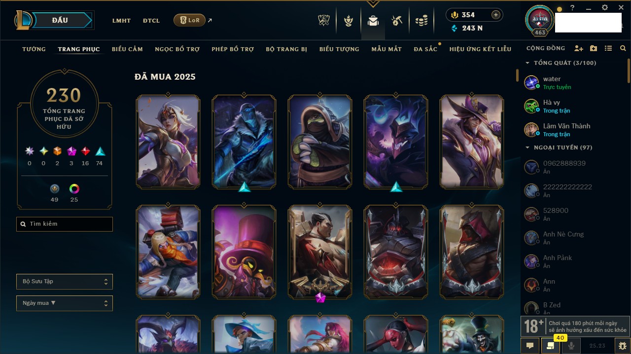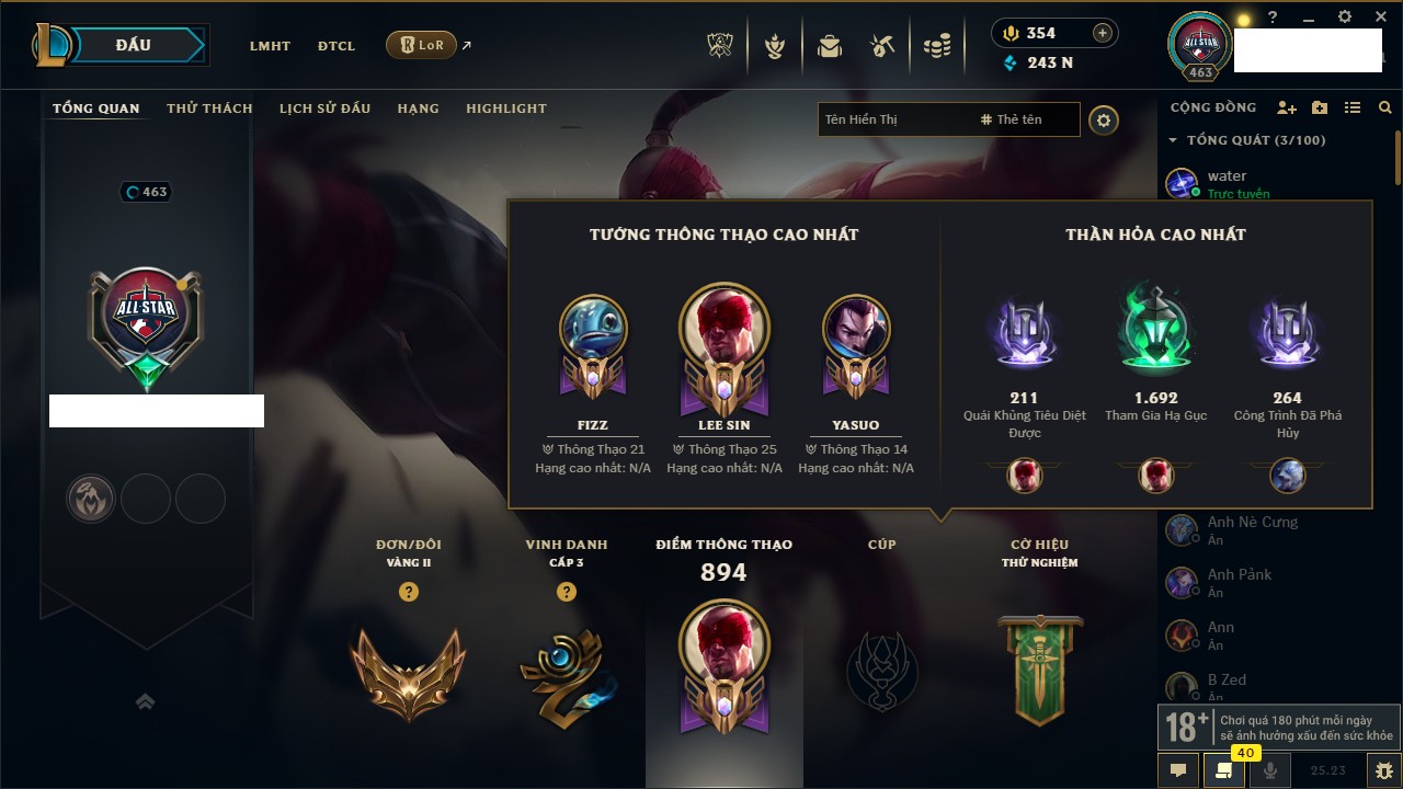 Rank Đơn: Bạch Kim IIKhung: Bạch kimTướng: 171 - Còn 316137 THXTrang Phục: 89Rank ĐTCL: Bạch Kim IIILinh Thú: 94