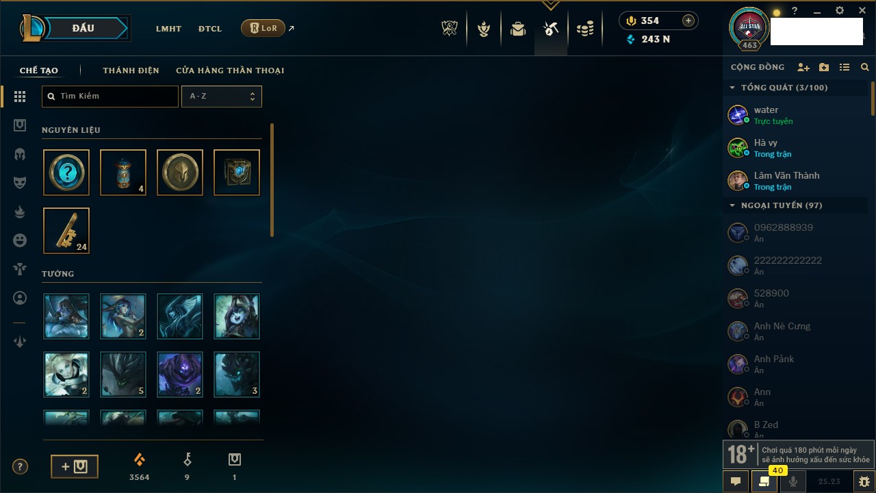 Rank Đơn: Lục Bảo IVKhung: VàngTướng: 171 - Còn 154648 THXTrang Phục: 203Rank ĐTCL: Bạch Kim IVLinh Thú: 69