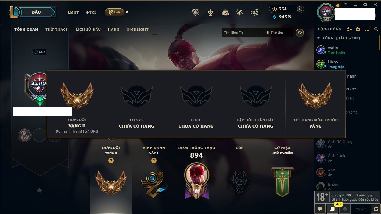 Rank Đơn: Bạch Kim IIIKhung: Bạch kimTướng: 171 - Còn 136108 THXTrang Phục: 261Rank ĐTCL: Bạc IVLinh Thú: 73