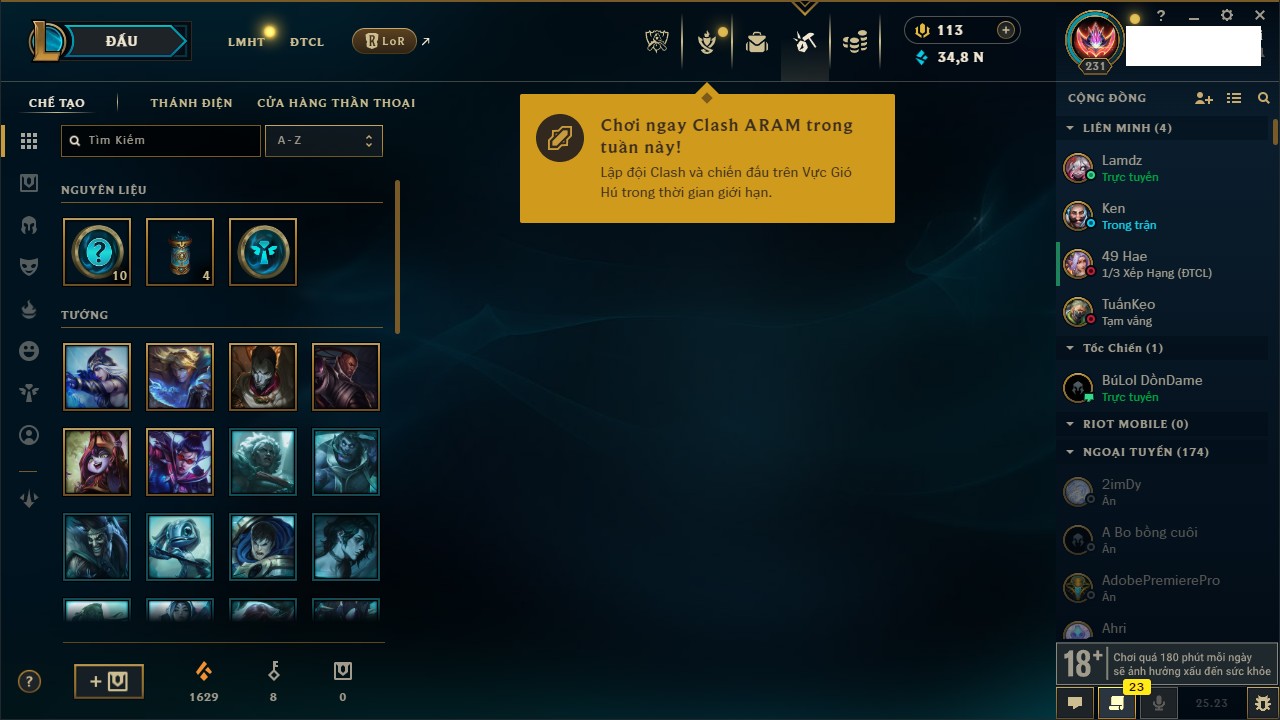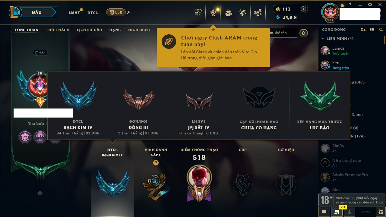 Rank Đơn: Bạc IVKhung: BạcTướng: 171 - Còn 43794 THXTrang Phục: 136Rank ĐTCL: Bạch Kim IVLinh Thú: 108