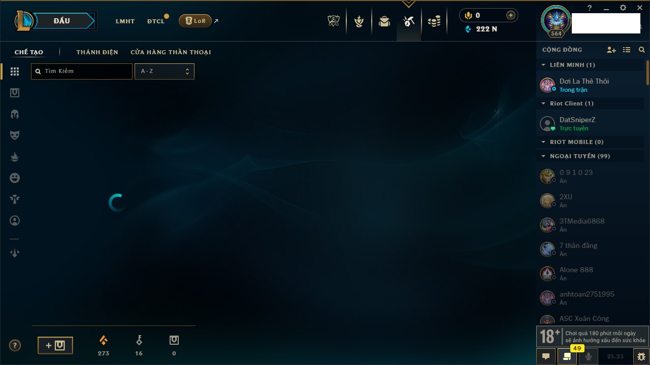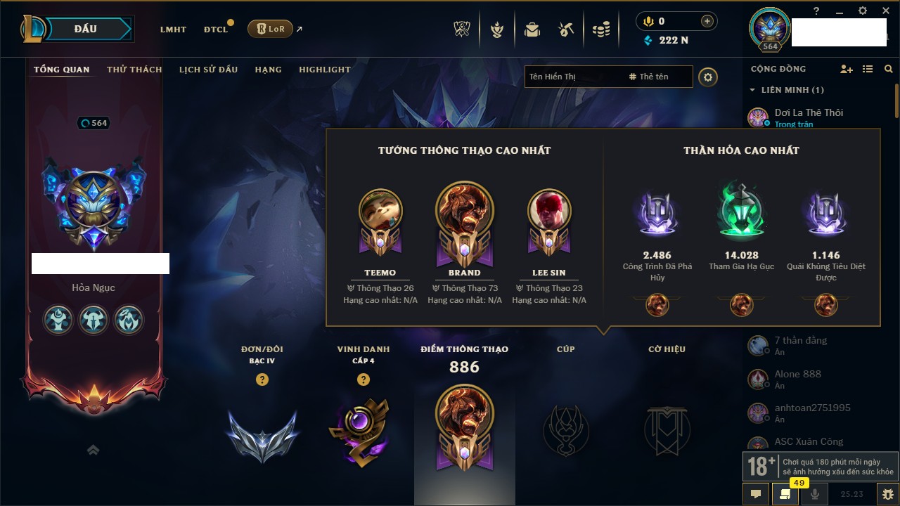 Rank Đơn: Vàng IVKhung: BạcTướng: 166 - Còn 180925 THXTrang Phục: 163Rank ĐTCL: Chưa RankLinh Thú: 67