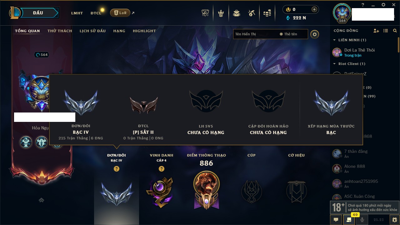 Rank Đơn: Bạc IIKhung: VàngTướng: 171 - Còn 332462 THXTrang Phục: 165Rank ĐTCL: Kim Cương IVLinh Thú: 181