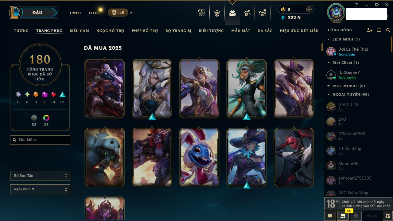 Rank Đơn: Vàng IVKhung: VàngTướng: 171 - Còn 48721 THXTrang Phục: 171Rank ĐTCL: Chưa RankLinh Thú: 27