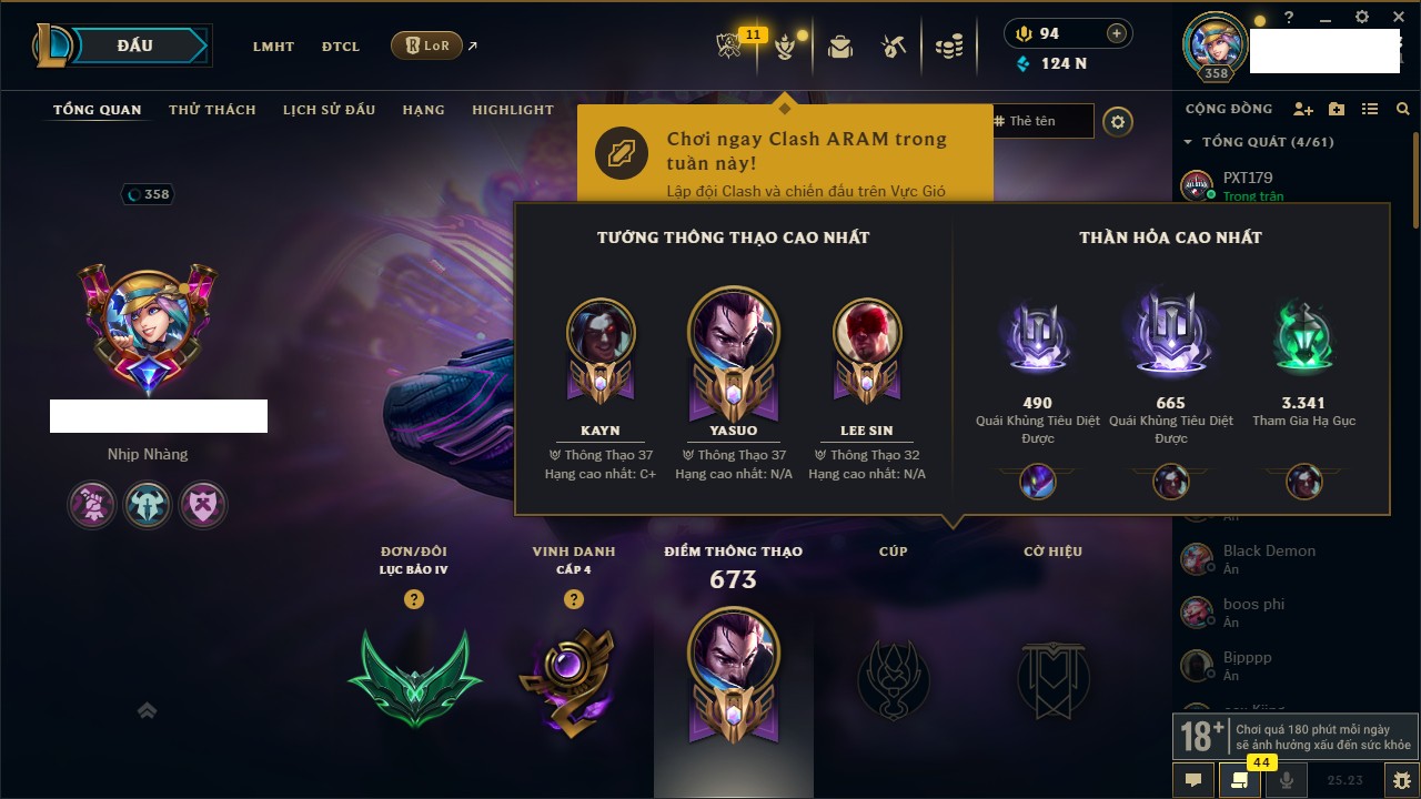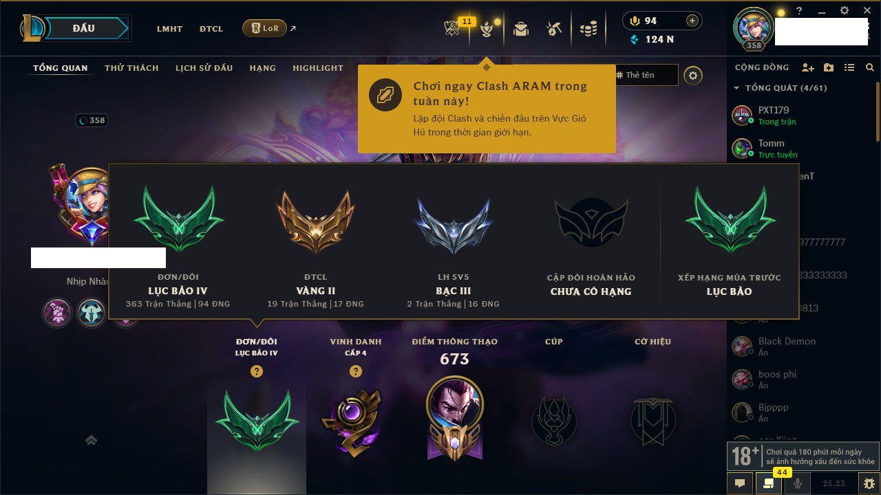 Rank Đơn: Lục Bảo IVKhung: Bạch kimTướng: 171 - Còn 128452 THXTrang Phục: 193Rank ĐTCL: Bạc IIILinh Thú: 100