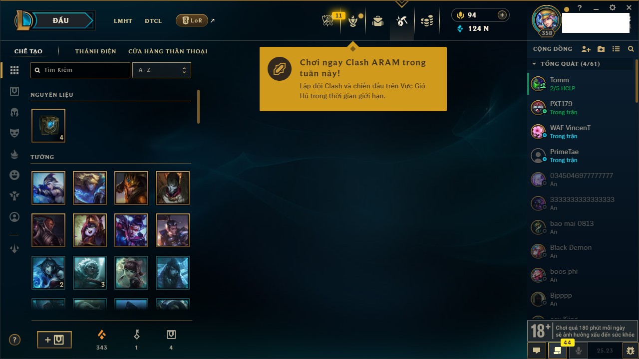 Rank Đơn: Vàng IIIKhung: BạcTướng: 171 - Còn 101359 THXTrang Phục: 88Rank ĐTCL: Kim Cương IVLinh Thú: 200
