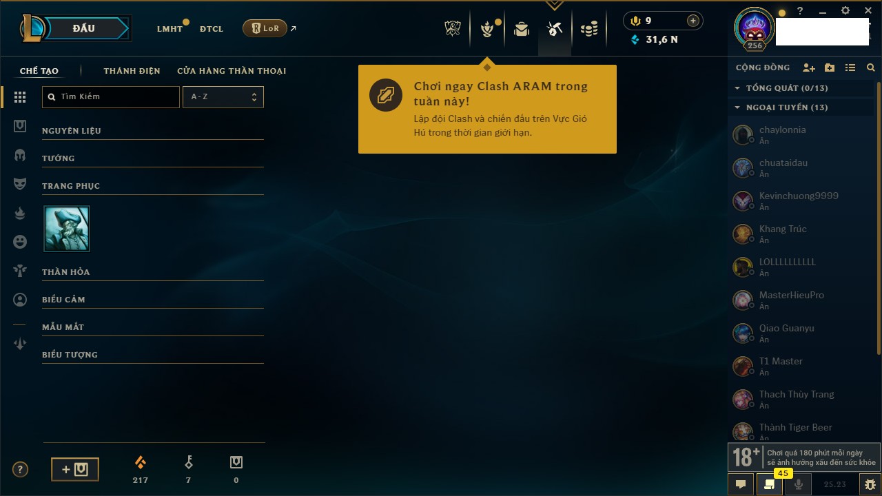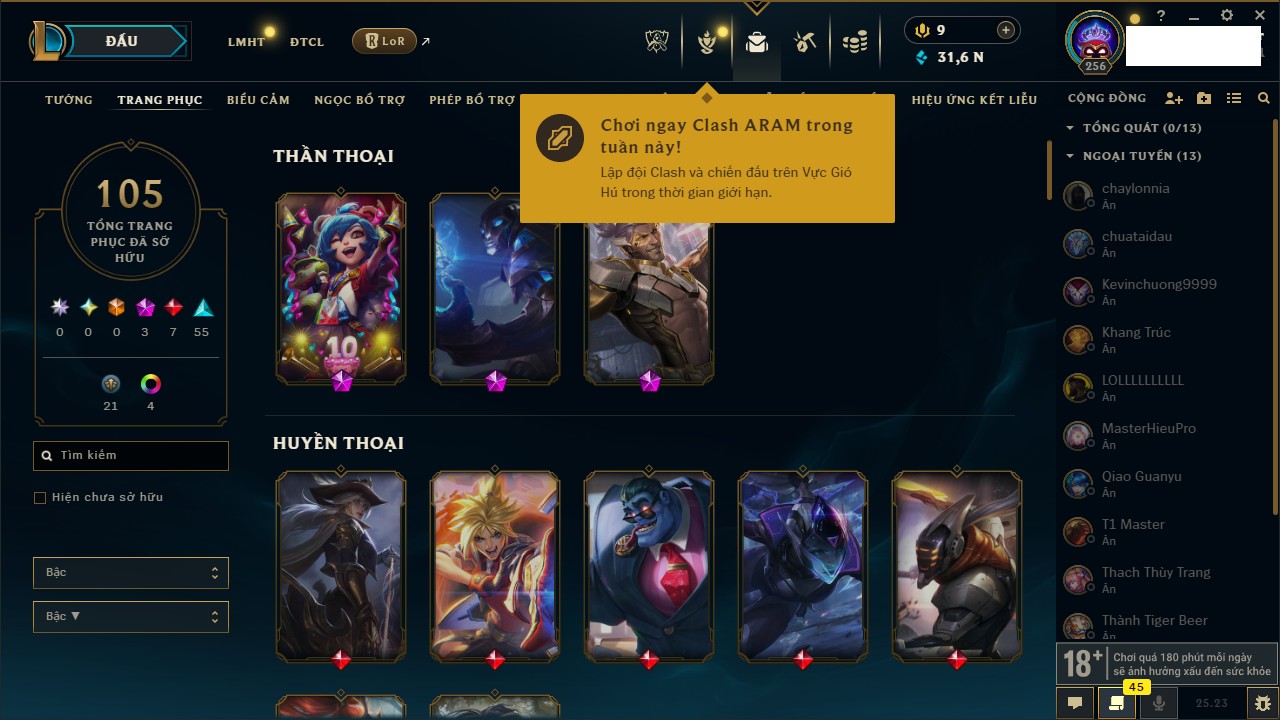 Rank Đơn: Vàng IVKhung: BạcTướng: 166 - Còn 180925 THXTrang Phục: 163Rank ĐTCL: Chưa RankLinh Thú: 67