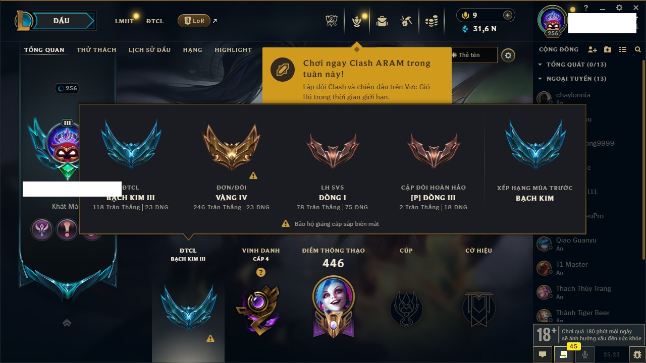 Rank Đơn: Bạc IIKhung: VàngTướng: 171 - Còn 332462 THXTrang Phục: 165Rank ĐTCL: Kim Cương IVLinh Thú: 181