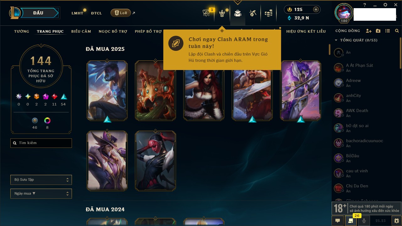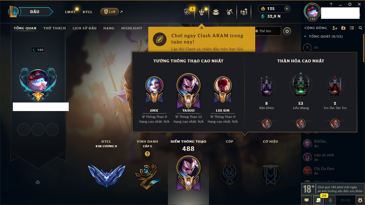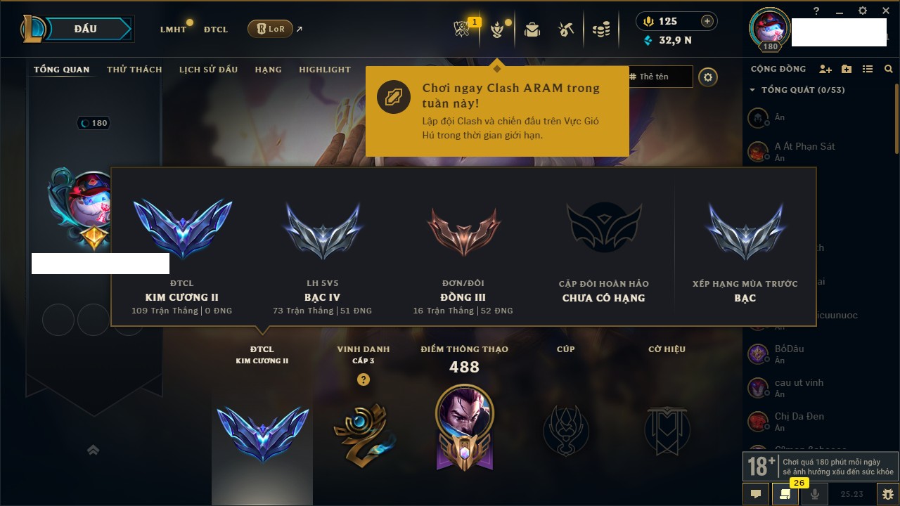 Rank Đơn: Đồng IIIKhung: Chưa có khungTướng: 152 - Còn 6423 THXTrang Phục: 160Rank ĐTCL: Chưa RankLinh Thú: 107