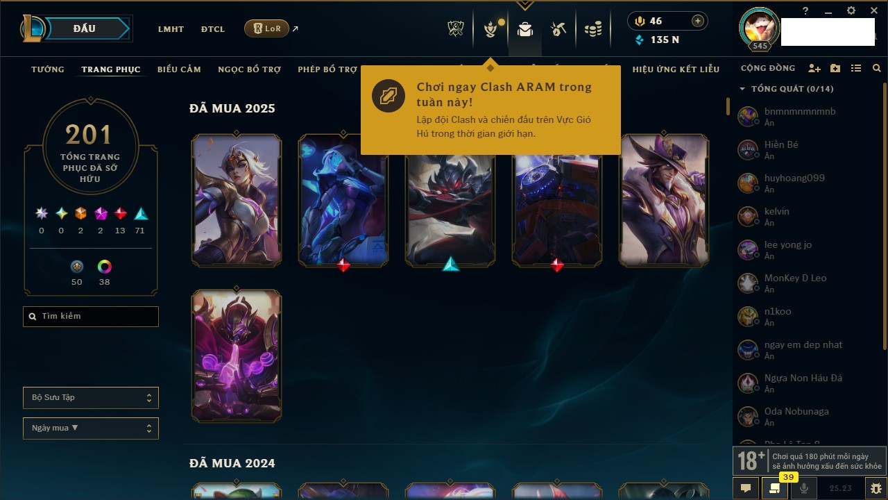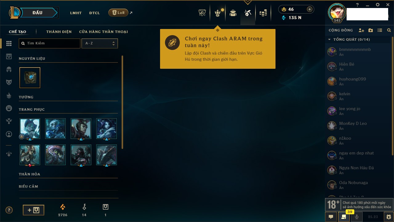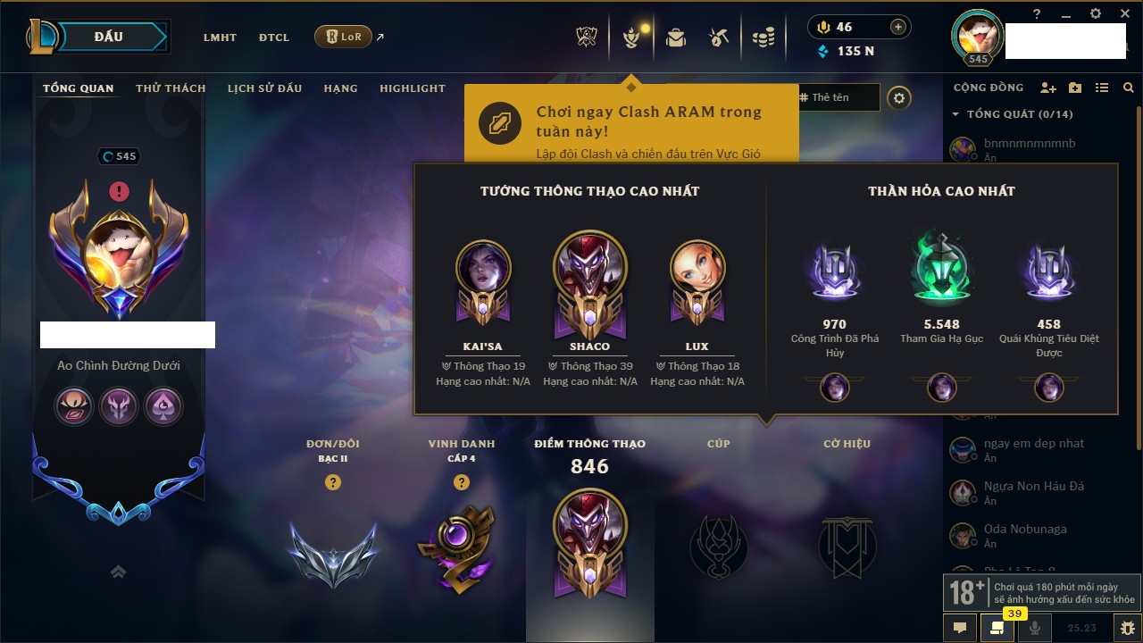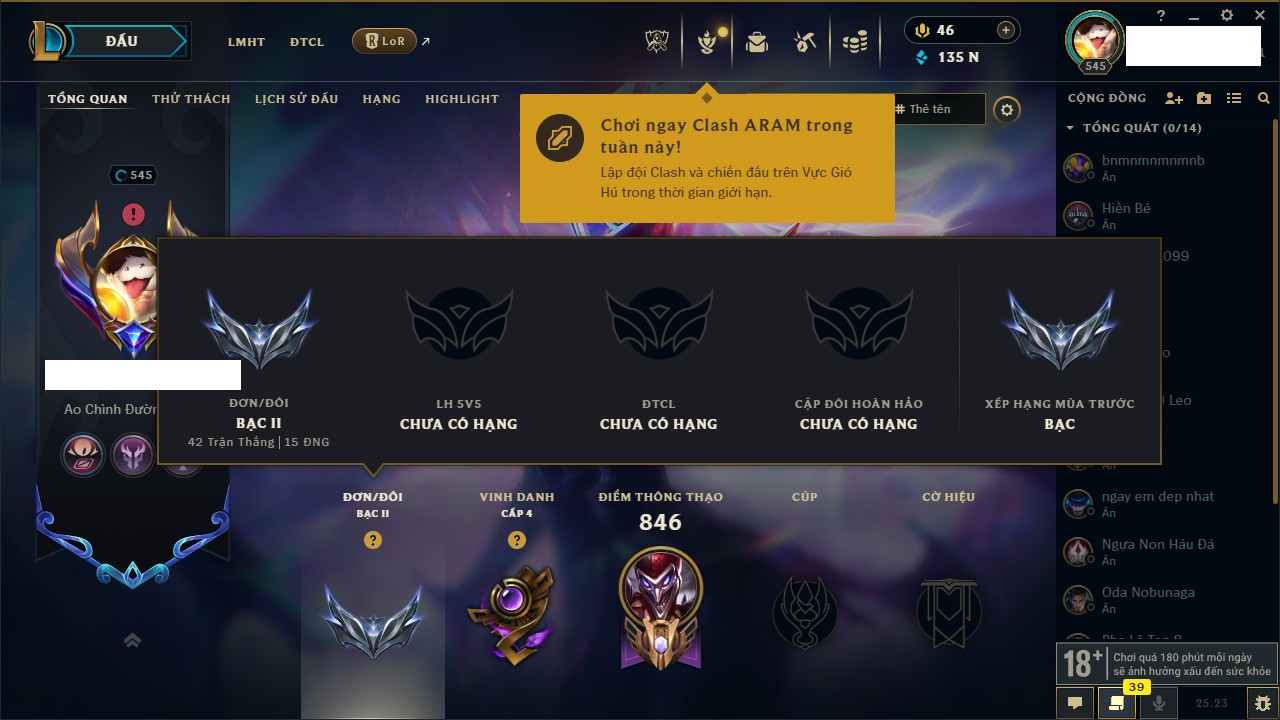 Rank Đơn: Bạc IIIKhung: BạcTướng: 171 - Còn 51045 THXTrang Phục: 220Rank ĐTCL: Sắt IILinh Thú: 141